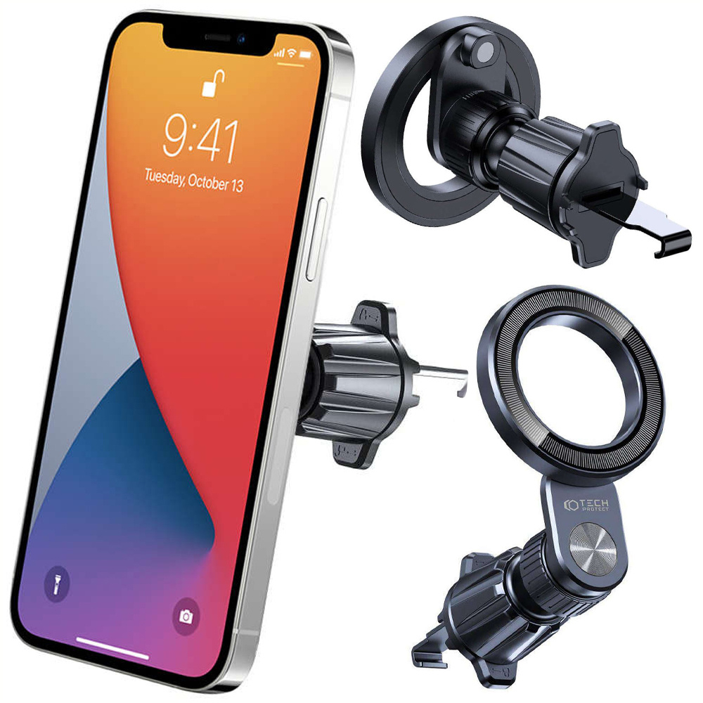 The holder is compatible with Apple smartphones with the MagSafe function, both without a cover and with a case that supports this function. In addition, any device that has a case with a magnetic ring can be placed in the holder.