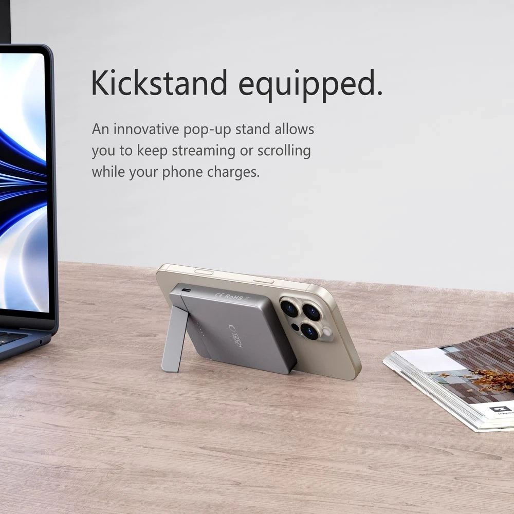 The device is equipped with a USB-C port , which allows for quick charging of both the power bank itself and other mobile devices. Additionally, the PB14 has a foldable pop-up stand , which allows you to comfortably position your phone vertically or horizontally - perfect for watching movies or video calls.
