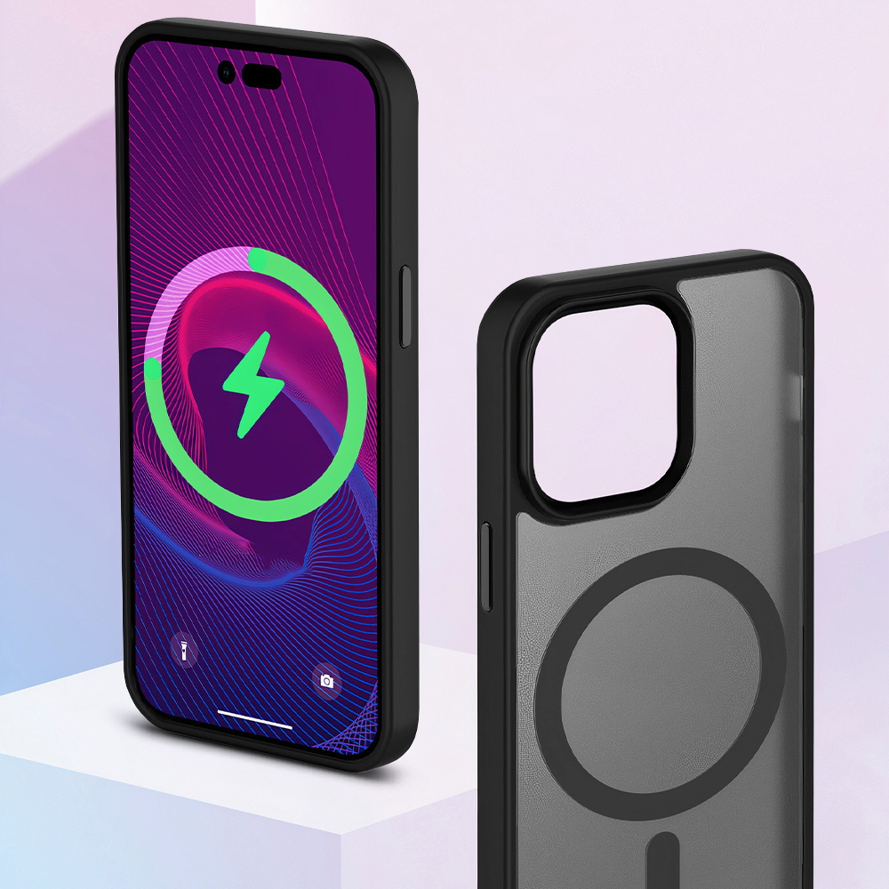 The case has a built-in magnet on the back, making it compatible with chargers and magnetic accessories, e.g. MagSafe leather wallet.
