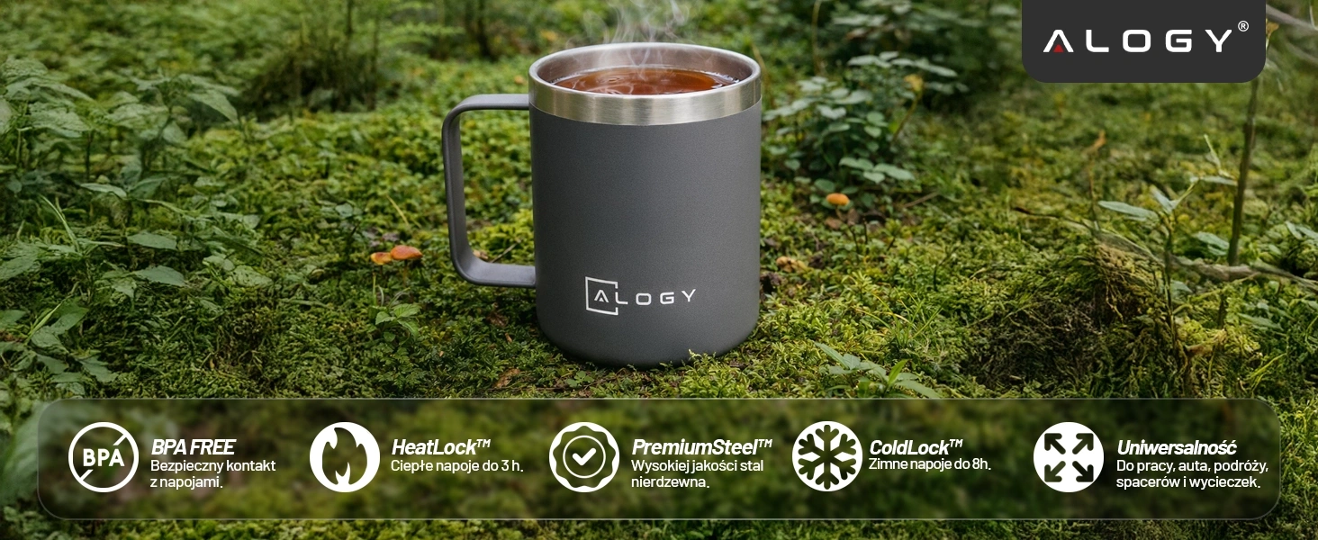 • Thermo mug 420ml with handle lid for coffee tea steel cold and hot drinks Alogy is a great gadget for camping, in the car and every day. The mug is not only functional, but also safe for health. It is BPA free.