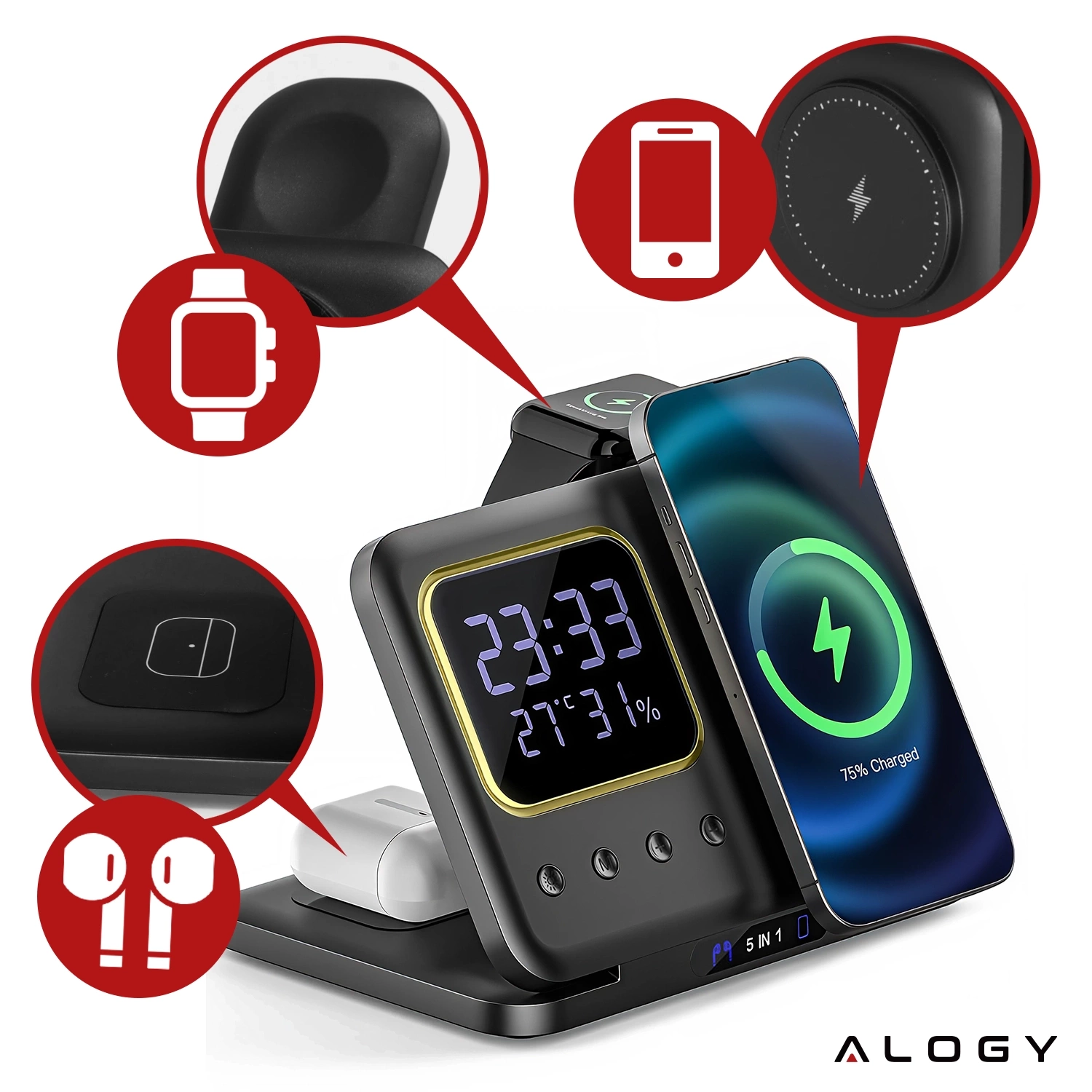 ✅ Now you can charge all your devices in one place – no cables, no mess, no stress. The 5-in-1 charging station with clock is a versatile and portable solution that not only charges your phone, headphones, and watch but also displays the current time, temperature, and humidity in the room.