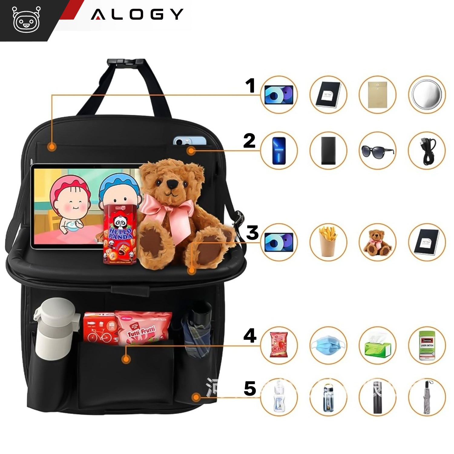 Organizer posiada aż 9 kieszeni oraz pojemny, rozkładany stolik.