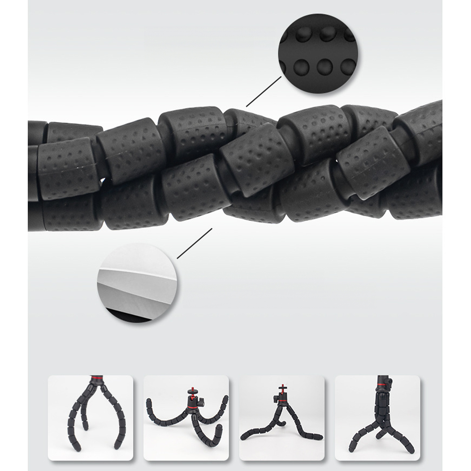Elastyczne nogi statywu zostały obudowane antypoślizgowym silikonem, co gwarantuje pewny chwyt. Dzięki tej konstrukcji użytkownik może łatwo zamocować statyw na różnych powierzchniach, zapewniając stabilność podczas fotografowania.