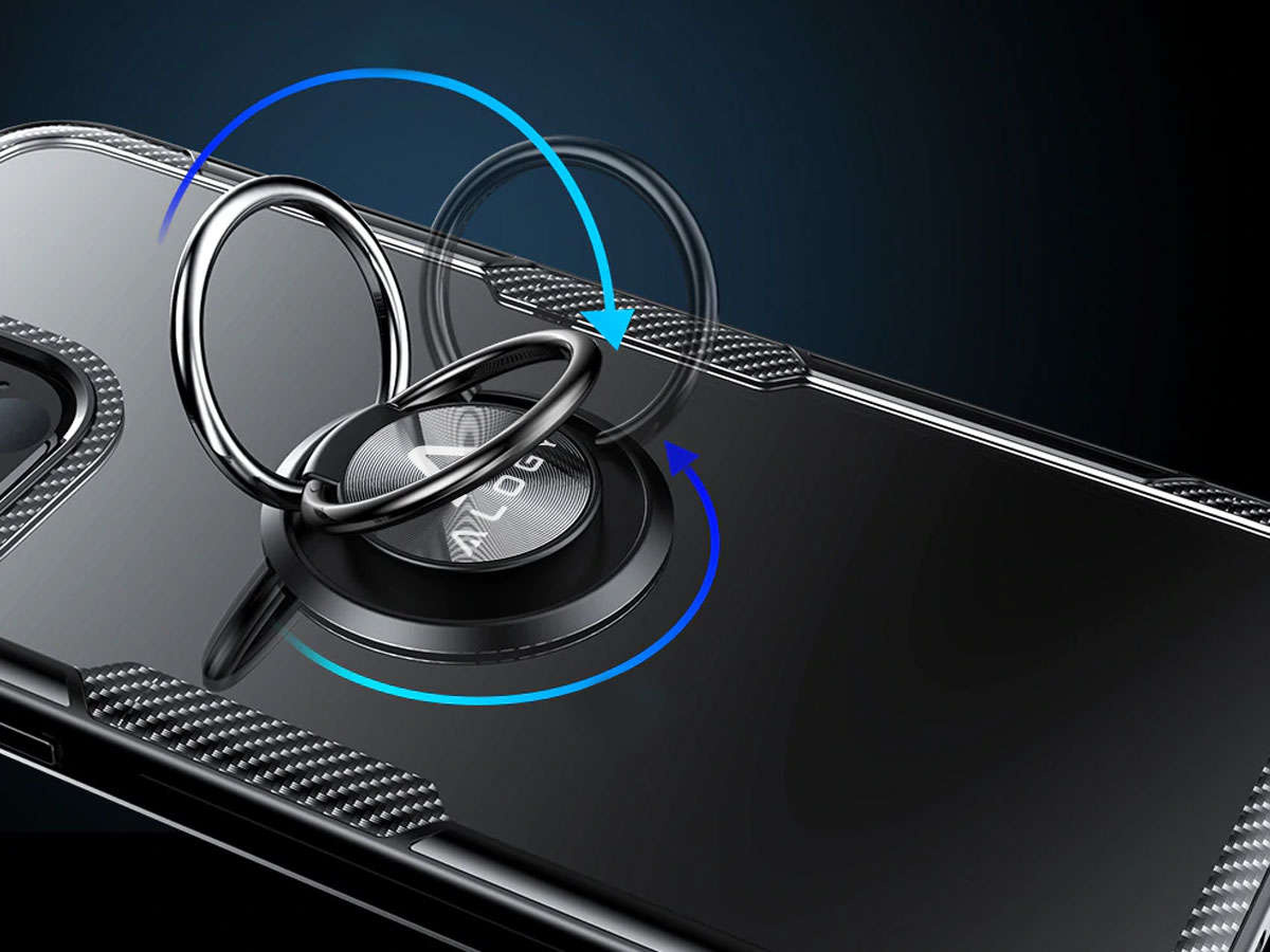 Plecki obudowy są wykonane z przezroczystego poliwęglanu, na środku którego znajduje się wbudowany, funkcjonalny uchwyt w kształcie pierścienia, który obraca się o 360 stopni. Może służyć jako podstawka, dzięki czemu można komfortowo przeglądać zawartość urządzenia czy też oglądać filmy. W centralnej części posiada metalową płytkę, która jest kompatybilna z wszystkimi magnetycznymi uchwytami. Ponadto pierścień może służyć również jako zaczep na palec dla zapewnienia pewnego chwytu. Pokrowiec posiada również rant ochronny wystający delikatnie ponad krawędź wyświetlacza oraz aparatu, chroniąc je przed porysowaniem i uszkodzeniem (brak styczności z podłożem).