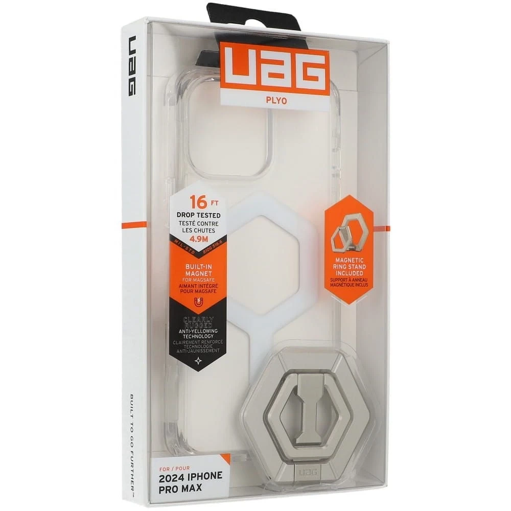 Etui UAG Plyo Ring Stand do iPhone 16 Pro Max w kolorze ice-white / titanium to połączenie nowoczesnego designu, legendarnej ochrony UAG oraz wygody użytkowania dzięki wbudowanemu pierścieniowi.