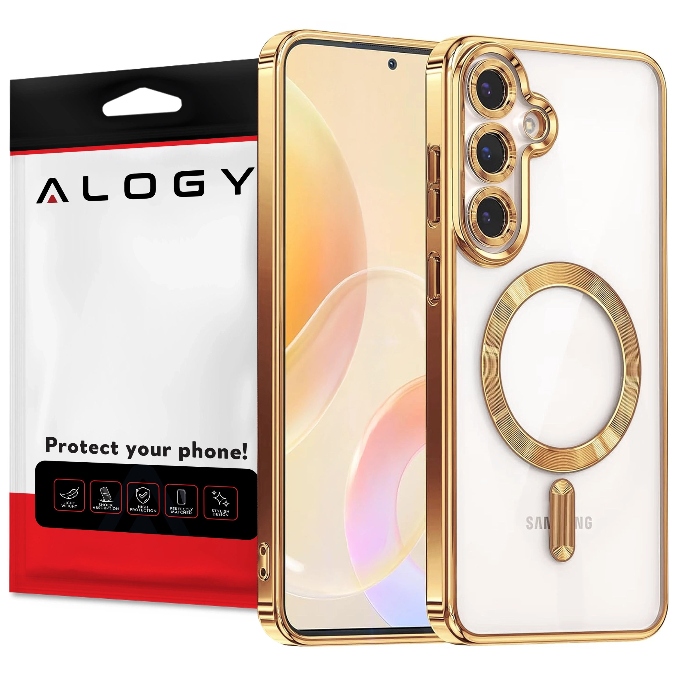 ✅ Etui Alogy LuxeShield™️ MagSafe Glamour Luxury Case dedykowane do Samsung Galaxy S25 oferuje ochronę klasy premium i perfekcyjne dopasowanie dzięki elastycznej ramce z poliuretanu. Złote wykończenie nadaje elegancji, skutecznie chroniąc aparat i obiektywy, a smukły design nie pogrubia telefonu.