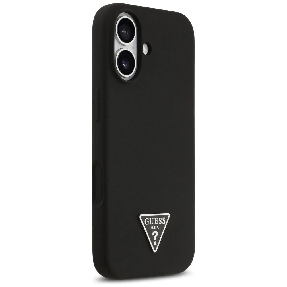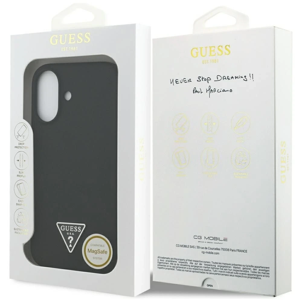 Etui Guess Hardcase Silicone Triangle Logo MagSafe do iPhone 17 w kolorze czarnym to połączenie luksusowego stylu, niezawodnej ochrony i funkcjonalności. Wykonane na oficjalnej licencji Guess przez firmę CG Mobile, zachwyca eleganckim designem oraz perfekcyjnym dopasowaniem.