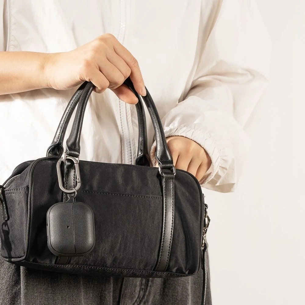 Dodatkowo etui wyposażano w praktyczny karabińczyk zwiększający zakres możliwości - słuchawki można podpiąć do smyczy z kluczami lub szlufki w spodniach dzięki czemu upadek czy zgubienie zestawu staje się wręcz niemożliwe.
