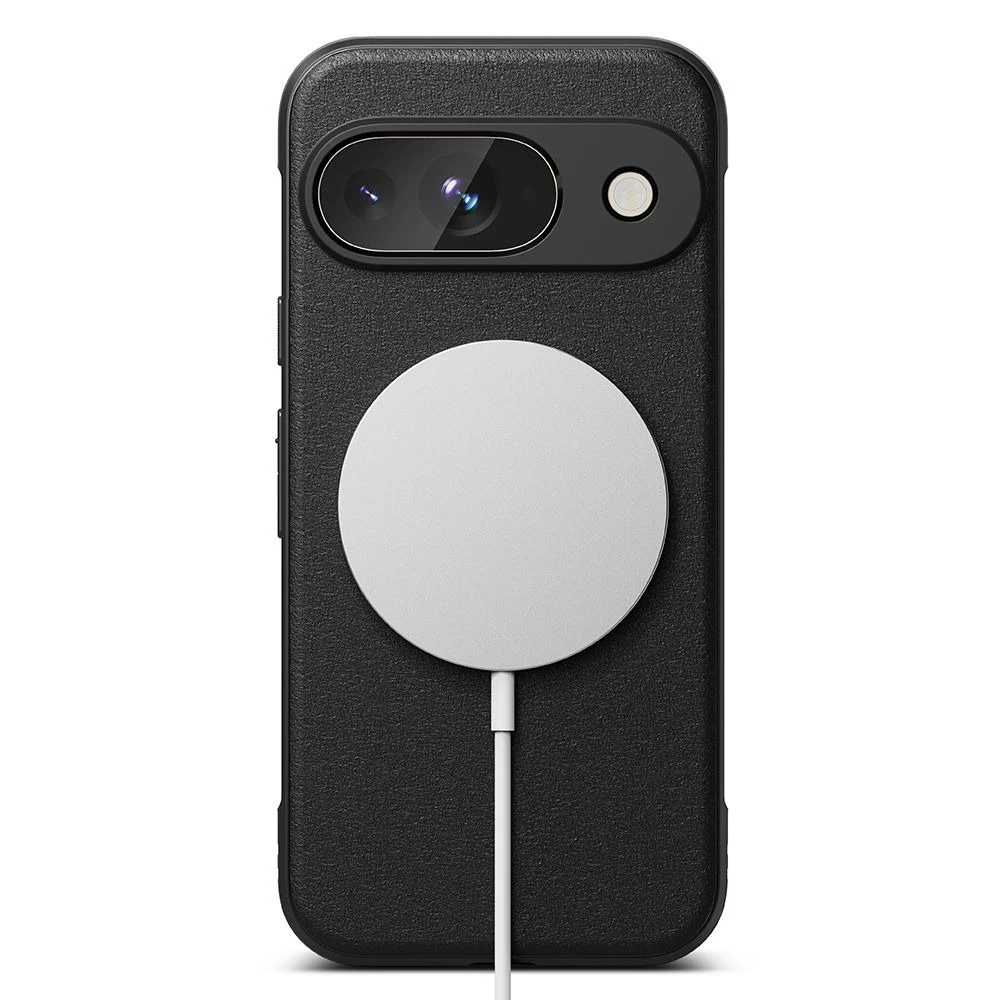 Etui z serii Onyx Magnetic Magsafe od firmy Ringke wykonane jest z miękkiego i wytrzymałego tworzywa termoplastycznego, dodatkowo wzmocnionego na krawędziach by jak najlepiej chronić urządzenie. Nieco podniesiona forma obudowy wokół aparatu i ekranu chroni go przed zarysowaniami, unosząc telefon tuż nad powierzchnią płaską. Posiada osłony na przyciski, wycięcia na porty i smycz.