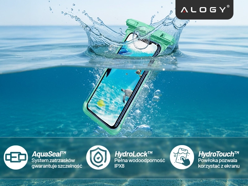 ⭐ Najnowszy model ⭐ Certyfikat IPX8 – ochrona do 10 m ⭐ HydroLock™ – technologia pełnej wodoodporności ⭐ AquaSeal™ – podwójne zamknięcie ⭐ HydroTouch™ – czuły ekran pod wodą ⭐ AntiFog Film™ – zero pary ⭐ Uniwersalne dopasowanie do 6.5” ⭐ Regulowany pasek na szyję ⭐ Odporność na kurz, błoto i piasek ⭐10 lat doświadczenia w branży ⭐ ponad 50.000 zadowolonych klientów marki Alogy ⭐
