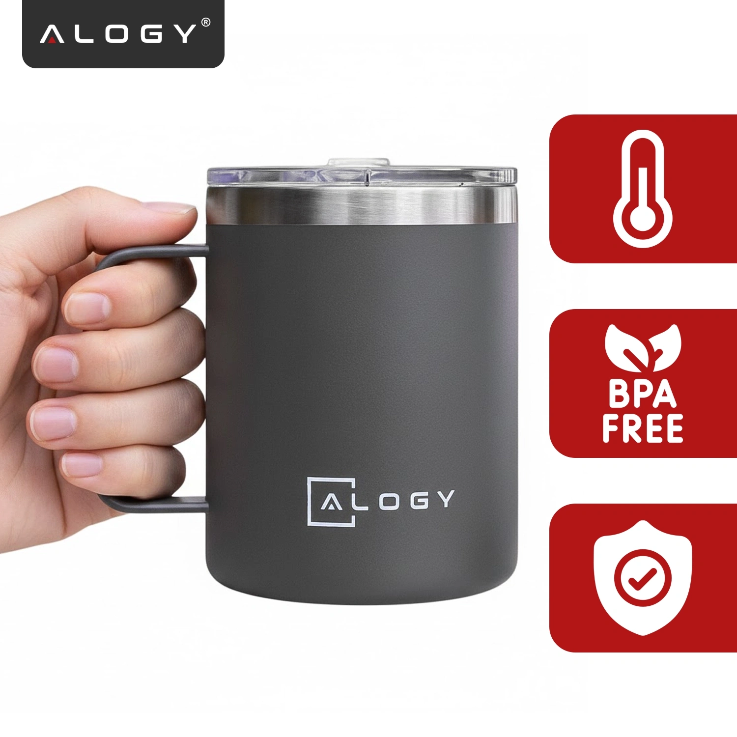 Opinie o Kubek termiczny 420ml z uchwytem pokrywką na kawę herbatę stalowy zimne i ciepłe napoje Alogy Szary