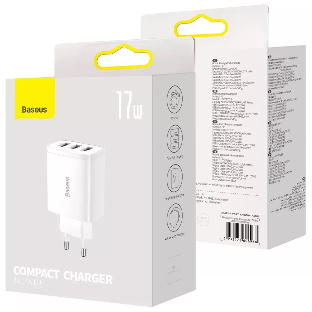 Ładowarka sieciowa Baseus Compact Quick Chargerposiada aż 3 porty ładujące USB-A, dzięki czemu mamy możliwość ładowania aż kilku urządzeń jednocześnie.
