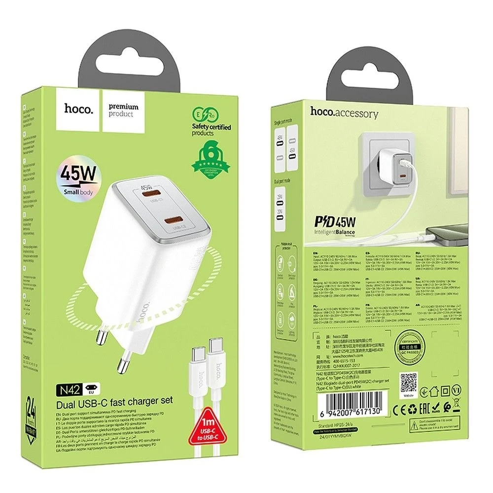 • Ładowarka Hoco N42 45 W z technologią GaN, 2× USB-C, wspiera szybkie ładowanie PD45W, QC 3.0, PPS, FCP, AFC. Ładuje 2 urządzenia jednocześnie. W zestawie kabel USB-C – USB-C (1 m). Wytrzymała, kompaktowa i bezpieczna.