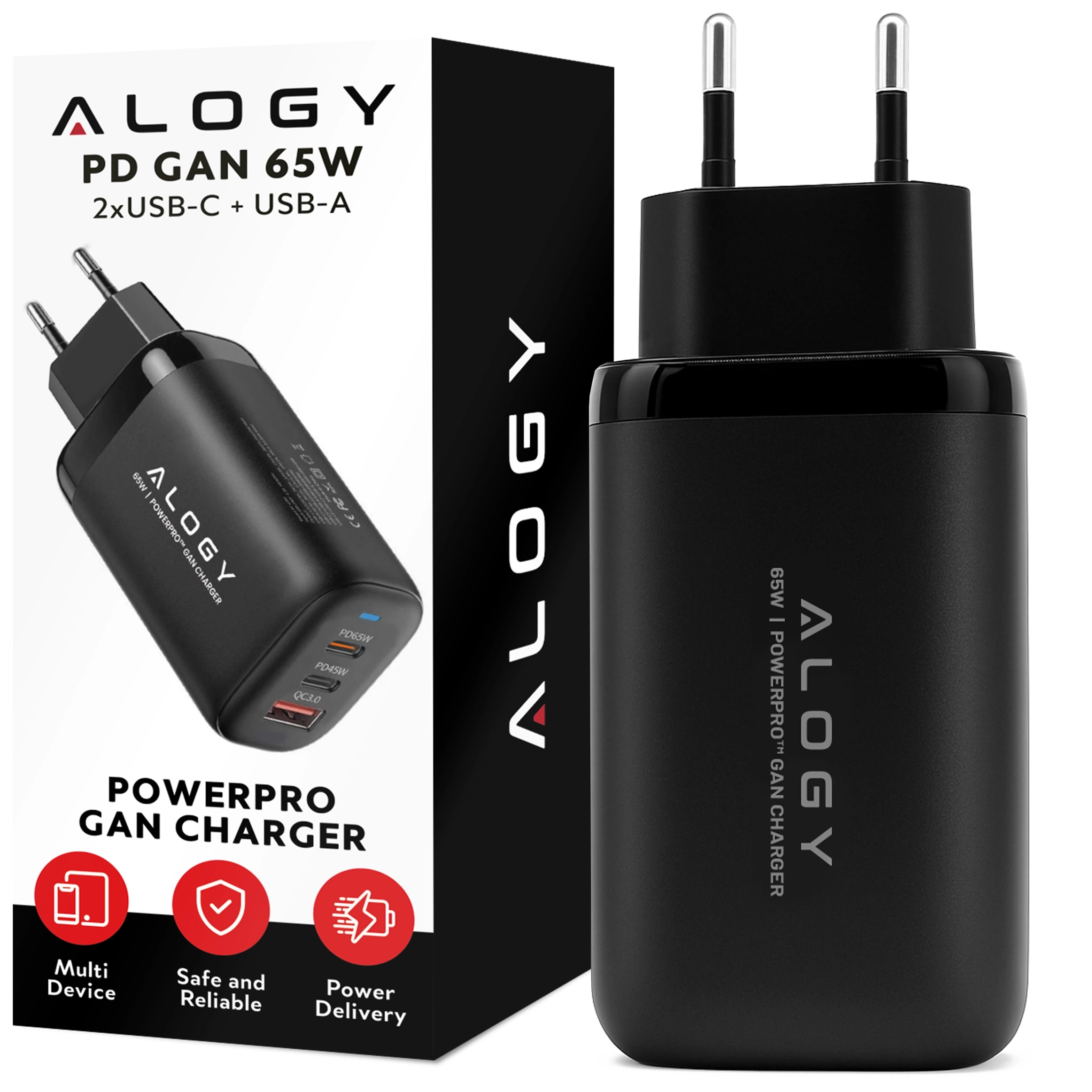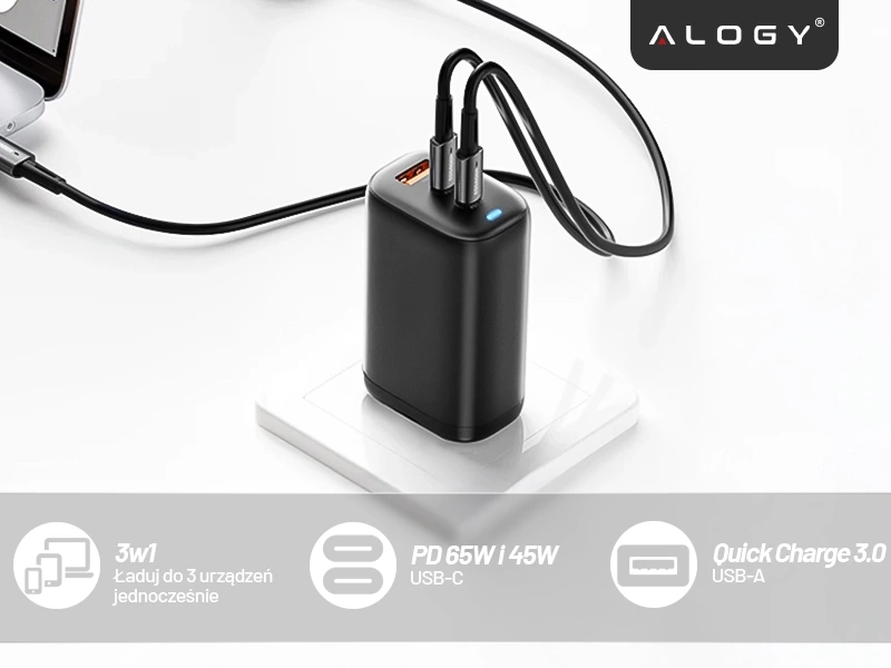 ▶️ Alogy GaN 65W 3-portowa ładowarka sieciowa 2×USB-C + USB-A – PD & QC