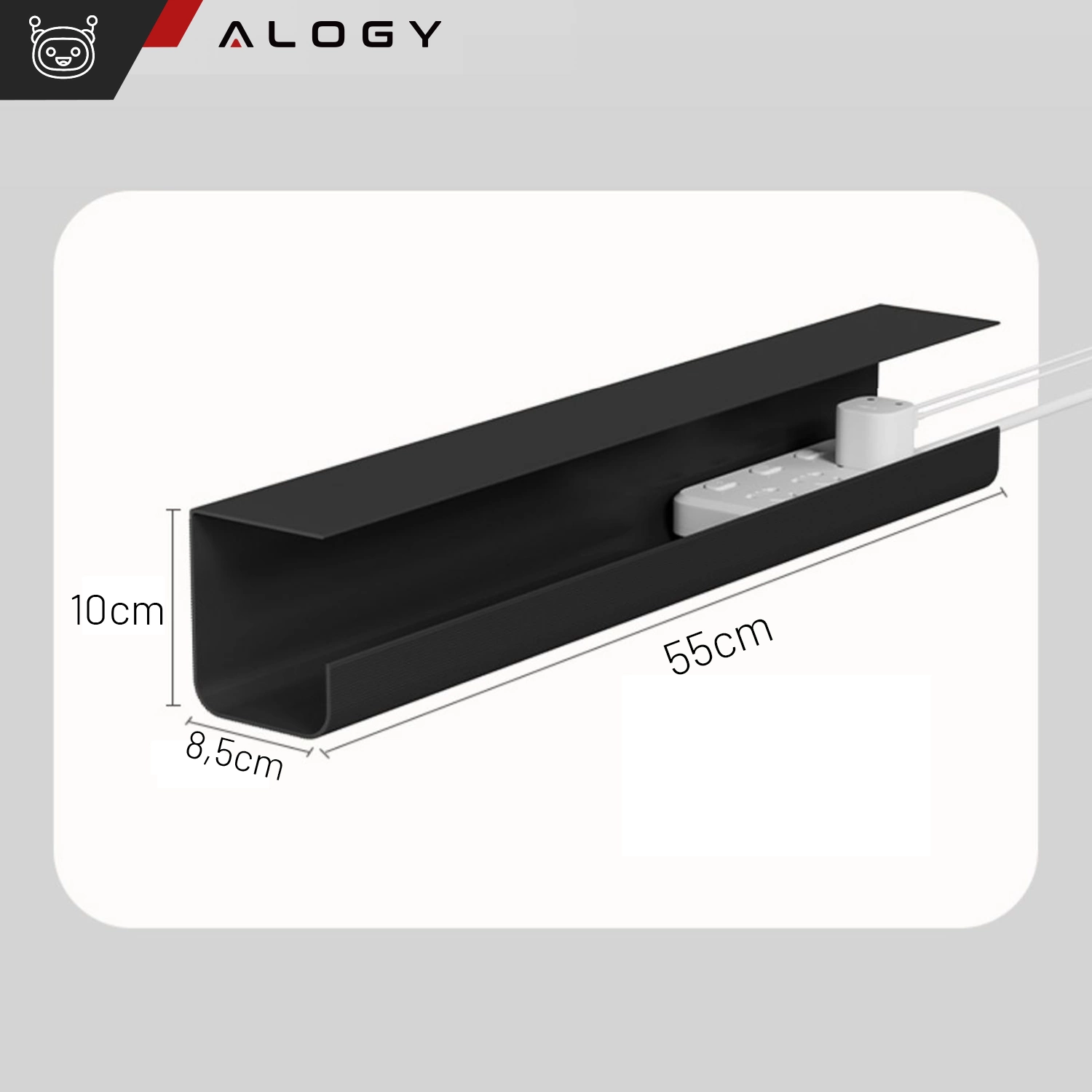 Organizer ma długość 55 cm i szerokość 8,5 cm, co pozwala na przechowywanie standardowej listwy zasilającej oraz kilku kabli. Jest idealny do uporządkowania przewodów, zapobiegania ich plątaniu oraz przechowywania dodatkowych akcesoriów, takich jak zasilacze czy ładowarki.