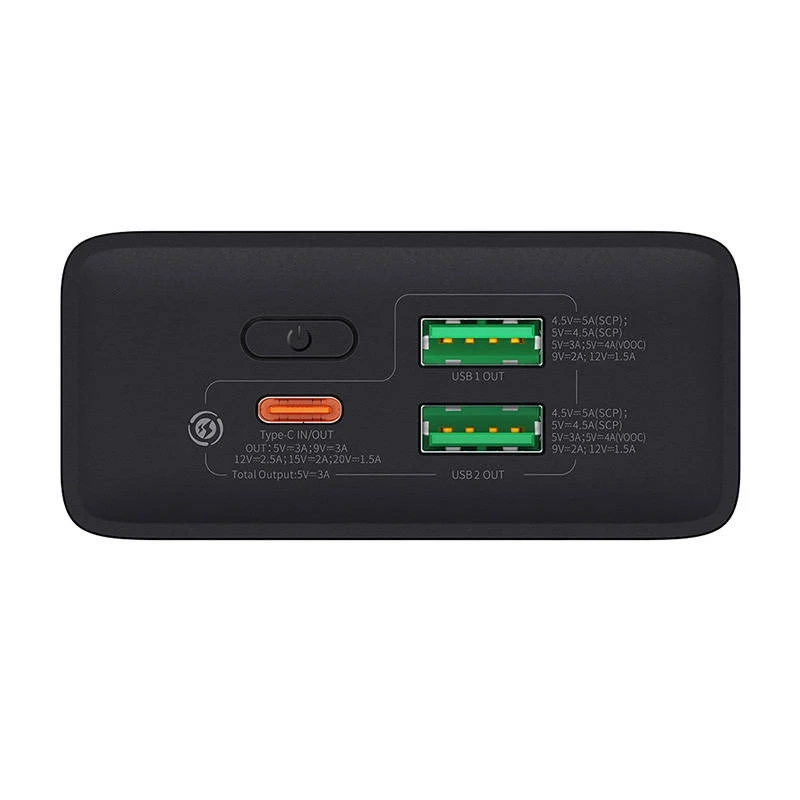 Producent Baseus Nazwa Baseus Adaman 2 Model PPAD050101 Kolor Czarny Pojemność akumulatora 20 000 mAh / 76Wh Pojemność znamionowa 1200 mAh (5V/3A) Typ akumulatora Polimerowo-litowy Współczynnik konwersji energii ≥75% Maksymalna moc 30 W (PD) Wejście USB-C 5V/3A, 9V/3A, 12V/2.5A, 15V/2A, 20V/1.5A Wyjście USB-C 5V/3A, 9V/3A, 12V/2.5A, 15V/2A, 20V/1.5A Wyjście USB1/USB2 4.5V/5A (SCP), 5V/4.5A (SCP), 5V/3A. 5V/4A (VOOC), 9V/2A, 12V/1.5A Całkowity prąd wyjściowy 5V/3A Wymiary 118 x 68.5 x 31 mm Waga około 360 g