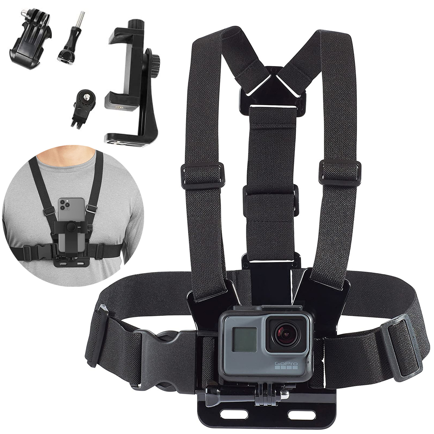 ✅ Uniwersalność 2w1 – dzięki dołączonym adapterom, szelki są kompatybilne zarówno z kamerami sportowymi (GoPro, DJI), jak i smartfonami o szerokości do 100 mm.