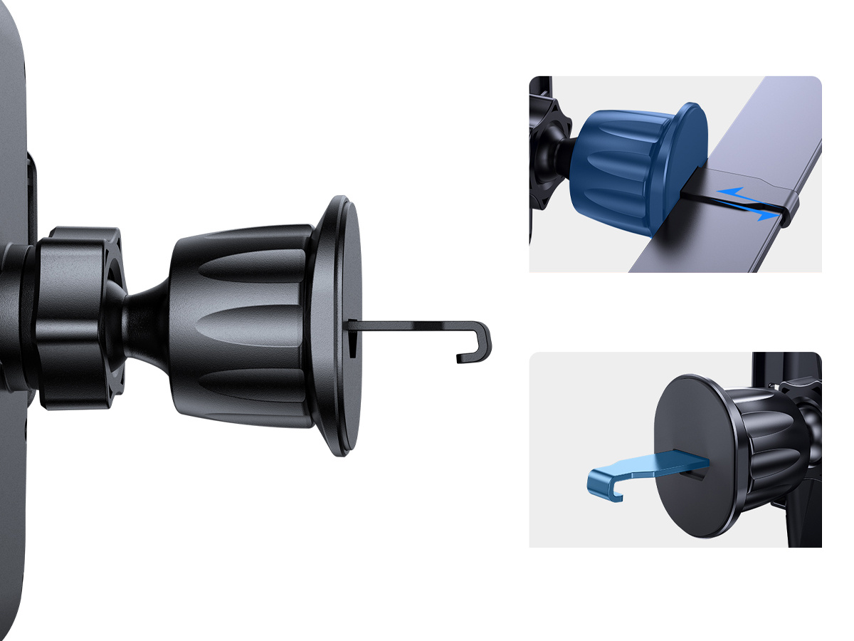 Posiada stabilną konstrukcję wykonaną z wysokiej jakości ABS i PC. Antypoślizgowa nakładka, wykonana z silikonu na panelu trzymania, zmniejsza ryzyko wyśliźnięcia się telefonu. Regulowane ramiona idealnie dopasują się do telefonu, gwarantując pewny chwyt. Mechaniczny przycisk ramion, pozwoli nam zintegrować szerokość uchwytu do smartfona. Produkt posiada hak, który montujemy w kratce wentylacyjnej samochodu, dzięki czemu mamy pewność że uchwyt nie przemieści się podczas jazdy.
