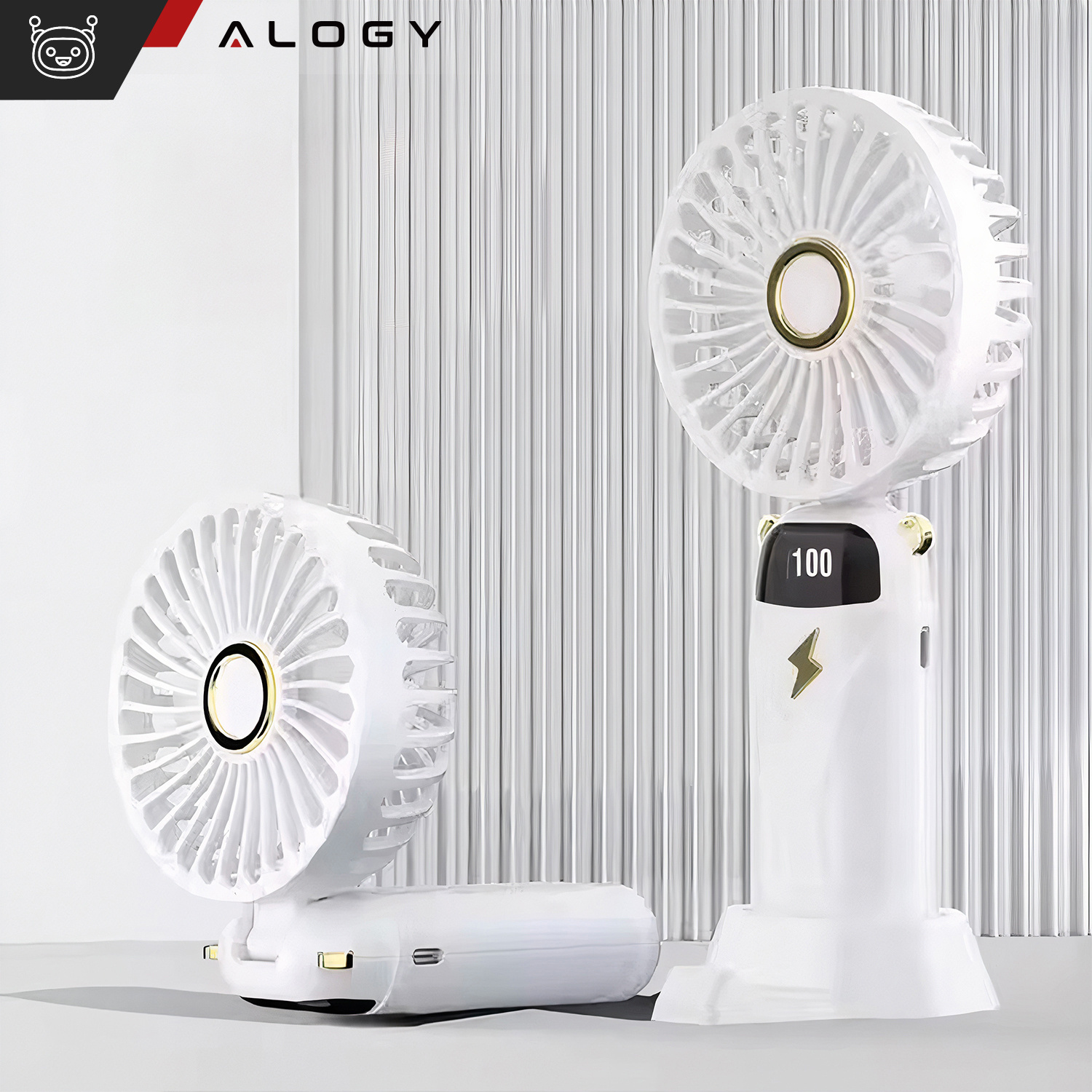 • Wentylator wiatrak wiatraczek ręczny bezprzewodowy Alogy przenośny do ręki z uchwytem na telefon USB-C to nowoczesny gadżet do codziennego użytku, zwłaszcza podczas podróży i pracy przy biurku. Posiada aż pięć trybów prędkości i ma niewielkie wymiary.