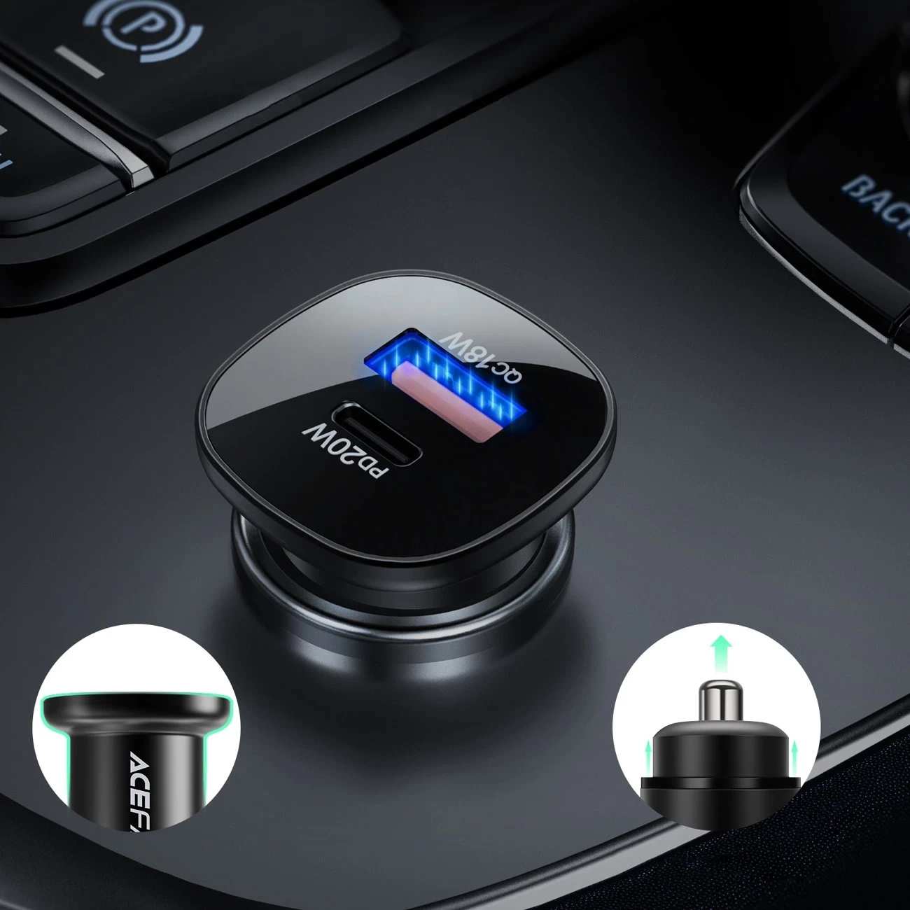 Rýchla autonabíjačka Acefast. Má 2 porty, USB typu C a USB. Prvá zástrčka USB typu C umožňuje nabíjanie s maximálnym výkonom 20 W a zástrčka USB až 18 W. Umožňuje okrem iného rýchle nabíjanie v štandardoch PPS, Power Delivery, Quick Charge 3.0, AFC a FCP. Je možné k nemu pripojiť dve zariadenia súčasne. Je vyrobený z ohňovzdorného PC materiálu. Bol vybavený mnohými ochranami, ako je prehriatie, prepätie, vysoké napätie alebo preťaženie.