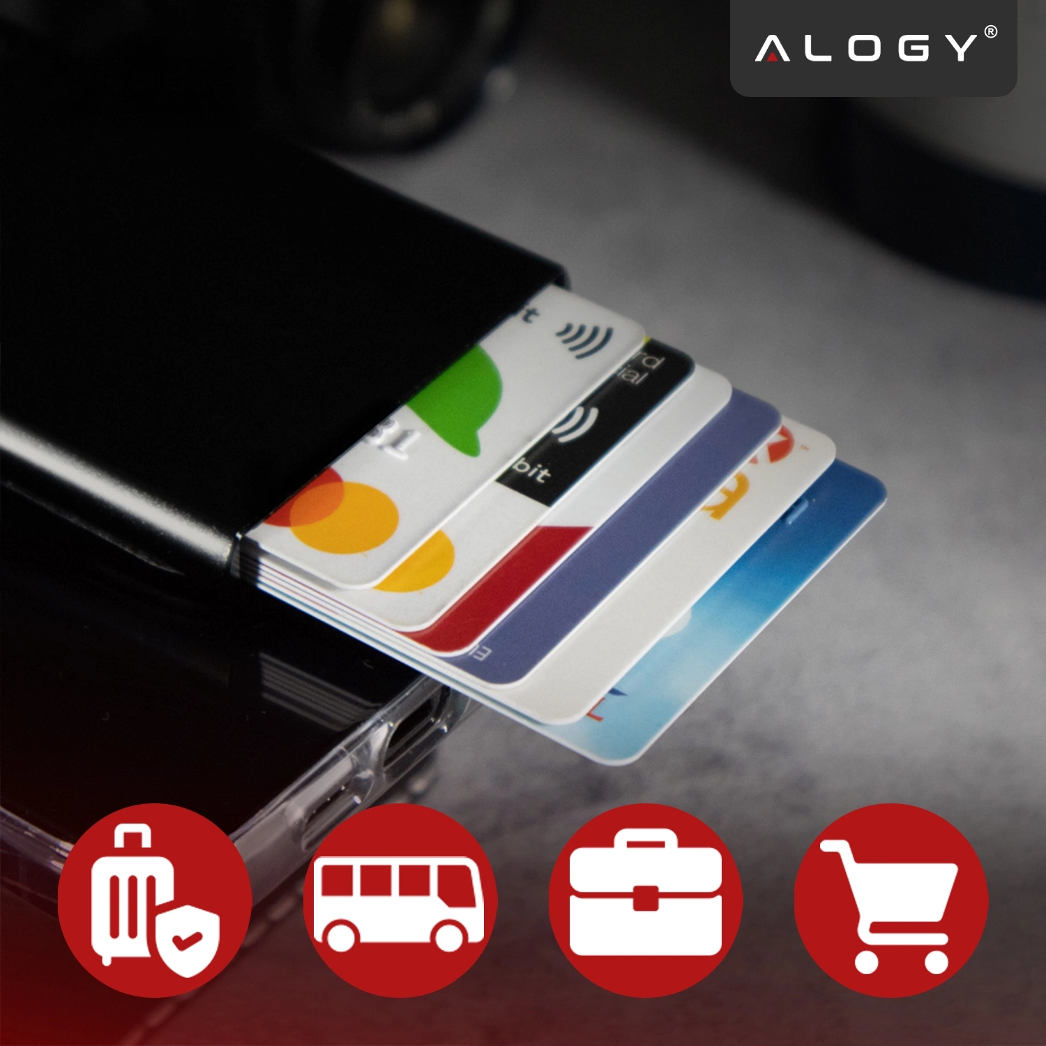 Peňaženka proti krádeži od značky Alogy je vyrobená z ľahkého hliníka a odolného titánu. Pojme 4 až 8 platobných kariet - v závislosti od typu umiestnených kariet (konvexné alebo ploché). Peňaženka má tiež flexibilné vrecko/priehradku, ktorú možno použiť ako miesto na uloženie mincí a bankoviek.