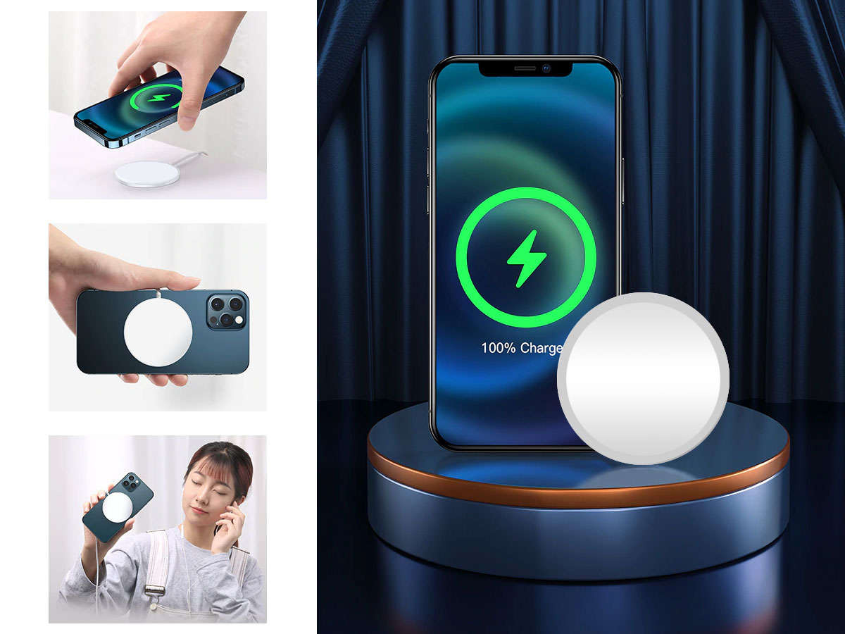 Nabíjačka je kompatibilná s najnovšími smartfónmi Apple : iPhone 12 mini, iPhone 12, iPhone 12 Pro, iPhone 12 Pro Max. Nabíjačku môžete použiť aj s inými zariadeniami, ktoré podporujú QI nabíjanie, bez nutnosti magnetického umiestňovania nabíjačky (stačí zariadenie položiť na nabíjačku).