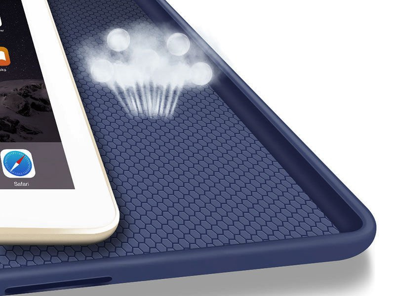 Celý bol vyrobený v starom štýle, tzv kniha, v ktorej je predná aj zadná obálka jedno. Zadný panel je vyrobený z flexibilného TPU, vďaka čomu dokonale padne k iPadu. Tento panel je navyše vybavený technológiou airbagov, ktorá zaručuje ešte väčšiu bezpečnosť nášho zariadenia pri nečakaných pádoch a špeciálna štruktúra „pavučiny“ ochráni zariadenie pred prehriatím. Puzdro disponuje funkciou budenia zariadenia - Sleep / Wake, čo výrazne ovplyvňuje dlhšiu výdrž batérie.