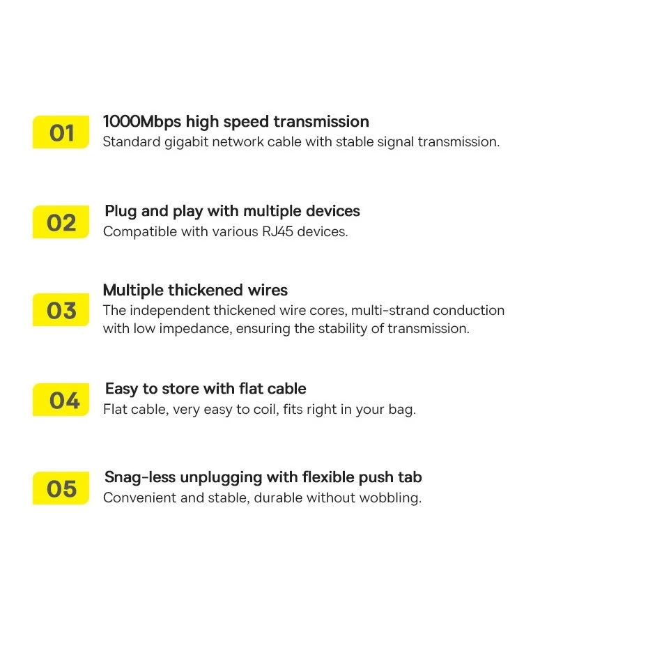 • Baseus Speed ​​​​Six plochý sieťový kábel RJ45 1000Mbps 15m Kábel je precízne vyrobený z vysoko kvalitných materiálov. Špeciálne koncovky zástrčiek ich chránia pred poškodením pri opakovanom ohýbaní.
