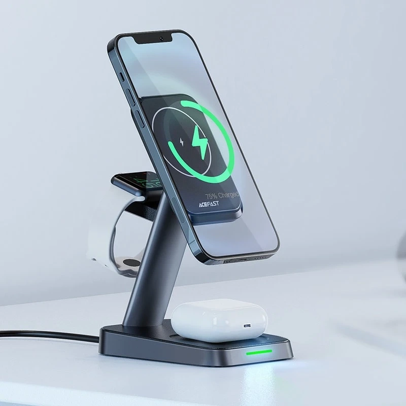 Malá stanica pre bezdrôtové nabíjanie troch zariadení súčasne – smartfónov, slúchadiel a smart hodiniek. Je kompatibilný s telefónmi, ktoré podporujú technológiu MagSafe , vrátane iPhone série 12 a vyššie. Acefast E3 si pohodlne nastavíte horizontálnym alebo vertikálnym nastavením telefónu. Magnetický držiak vám umožní pohodlne odložiť telefón a takmer okamžite ho nabiť .