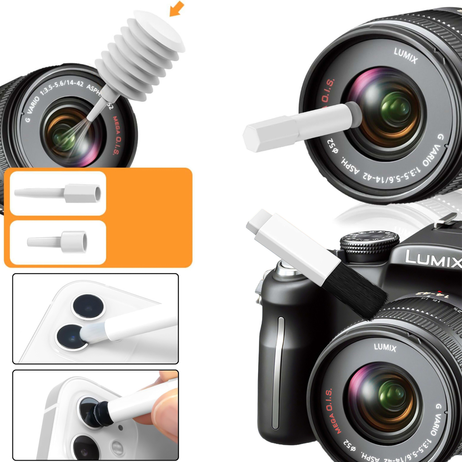 Pero a ofukovač na čistenie šošoviek fotoaparátu : efektívne odstraňujte odtlačky prstov, prach a iné nečistoty, ktoré môžu ovplyvniť kvalitu obrazu na objektívoch smartfónov a fotoaparátov.