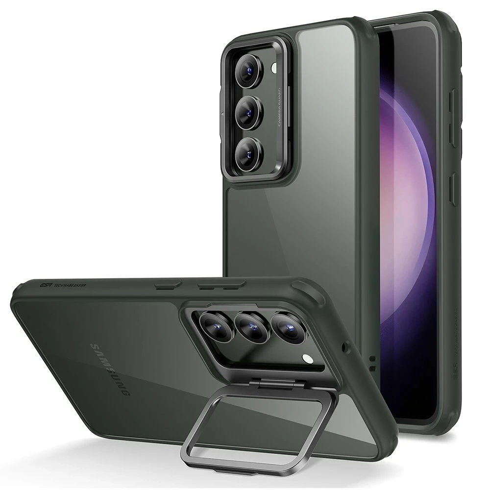 Okrem štandardnej, vyvýšenej krytky okolo šošoviek je puzdro navyše vybavené kovovým, otváracím rámom, ktorý možno ľahko premeniť na funkčný stojan. Má kryty tlačidiel a výrezy portov.