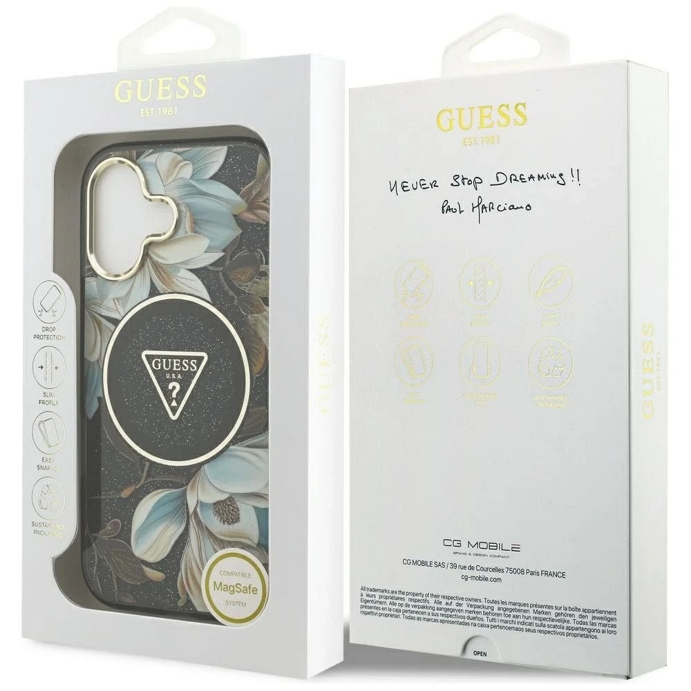 Etui Guess IML Metal Glitter Flowers Triangle MagSafe do iPhone 17 to połączenie elegancji, modnego designu i ochrony premium. Czarna kolorystyka z kwiatowym wzorem i subtelnym połyskiem brokatu sprawia, że smartfon zyskuje wyjątkowy charakter. Subtelne logo Guess i magnetyczny pierścień MagSafe czynią z etui zarówno praktyczne, jak i prestiżowe akcesorium.