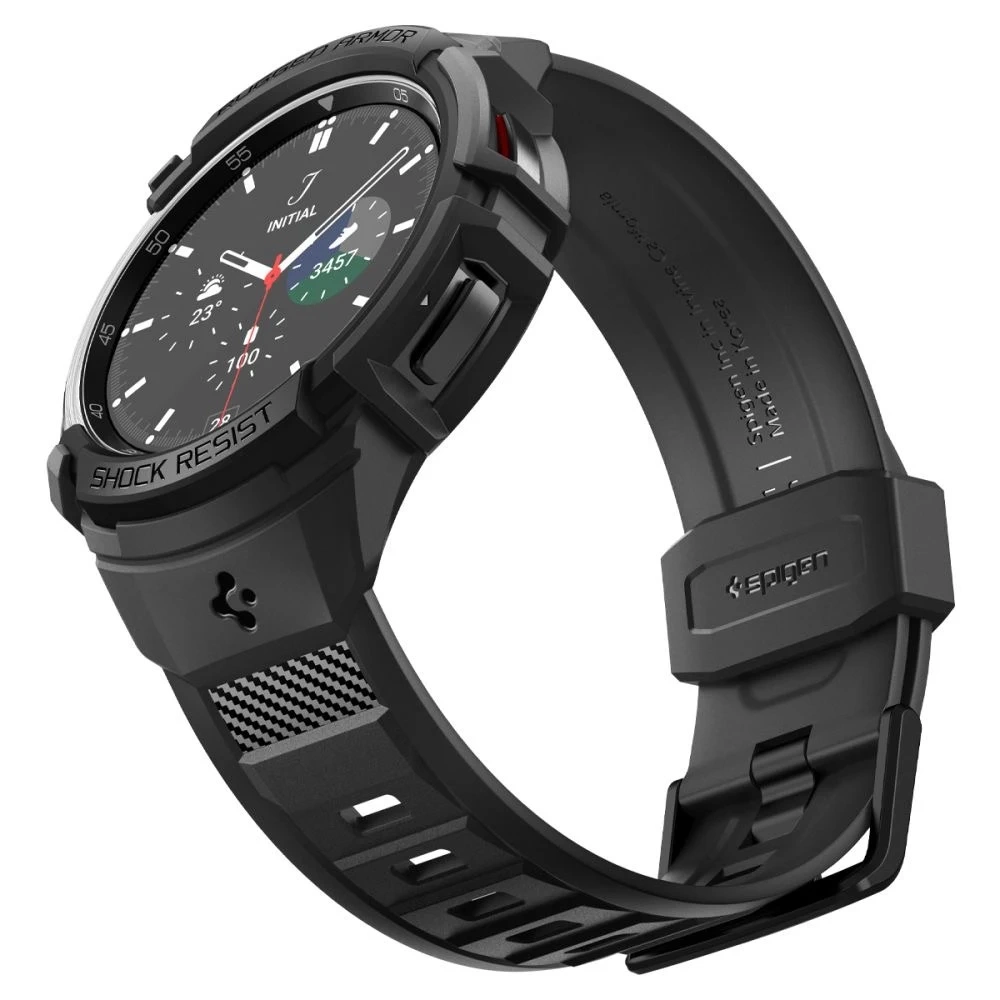 • Puzdro Spigen Rugged Armor "Pro" pre Samsung Galaxy Watch 6 Classic (47 mm) vyrobené z pružného TPU materiálu zdobeného akcentmi z uhlíkových vlákien.