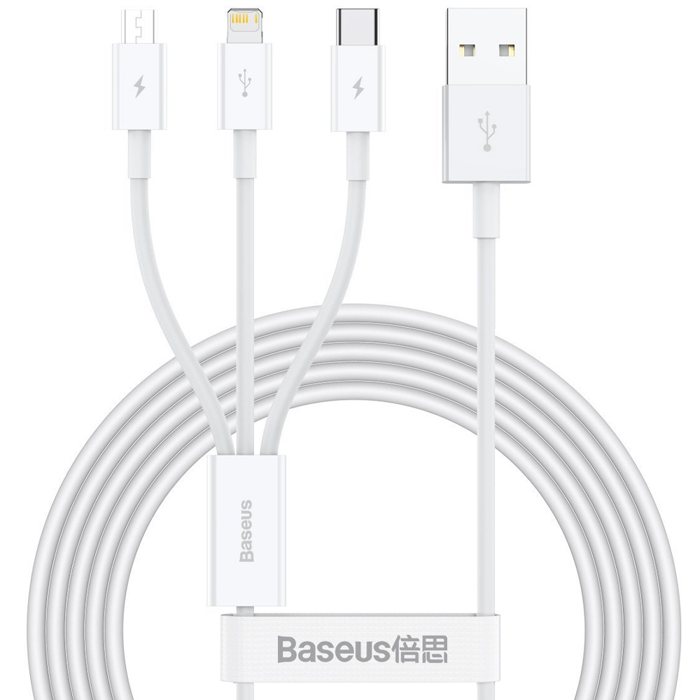 Kábel USB 3-v-1 od Baseus zo série Superior bol vyrobený z najkvalitnejších materiálov a má až 3 konektory: USB-C typu C, micro USB a Lightning. Výrobok je mimoriadne flexibilný, odolný voči poškodeniu a zároveň jeho kompaktné rozmery umožňujú pohodlné skladovanie.