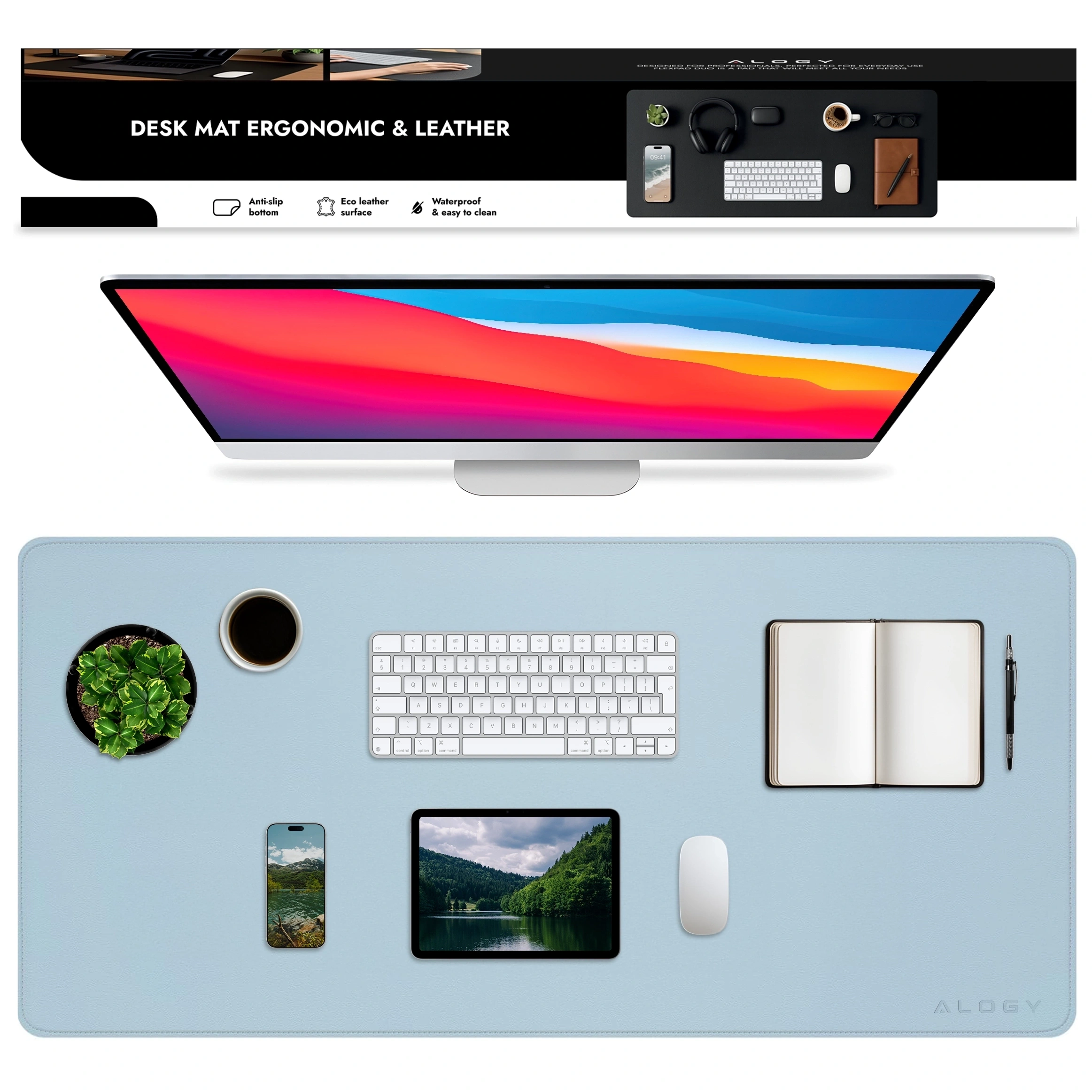 • Modrá vodeodolná podložka pod myš Alogy WorkMat™ 100x50 cm z PU kože chráni vašu pracovnú plochu pred poškriabaním a poliatím. Jej hladký povrch nahrádza podložku pod myš a klávesnicu. Prešité okraje zaisťujú odolnosť a elegantný vzhľad.