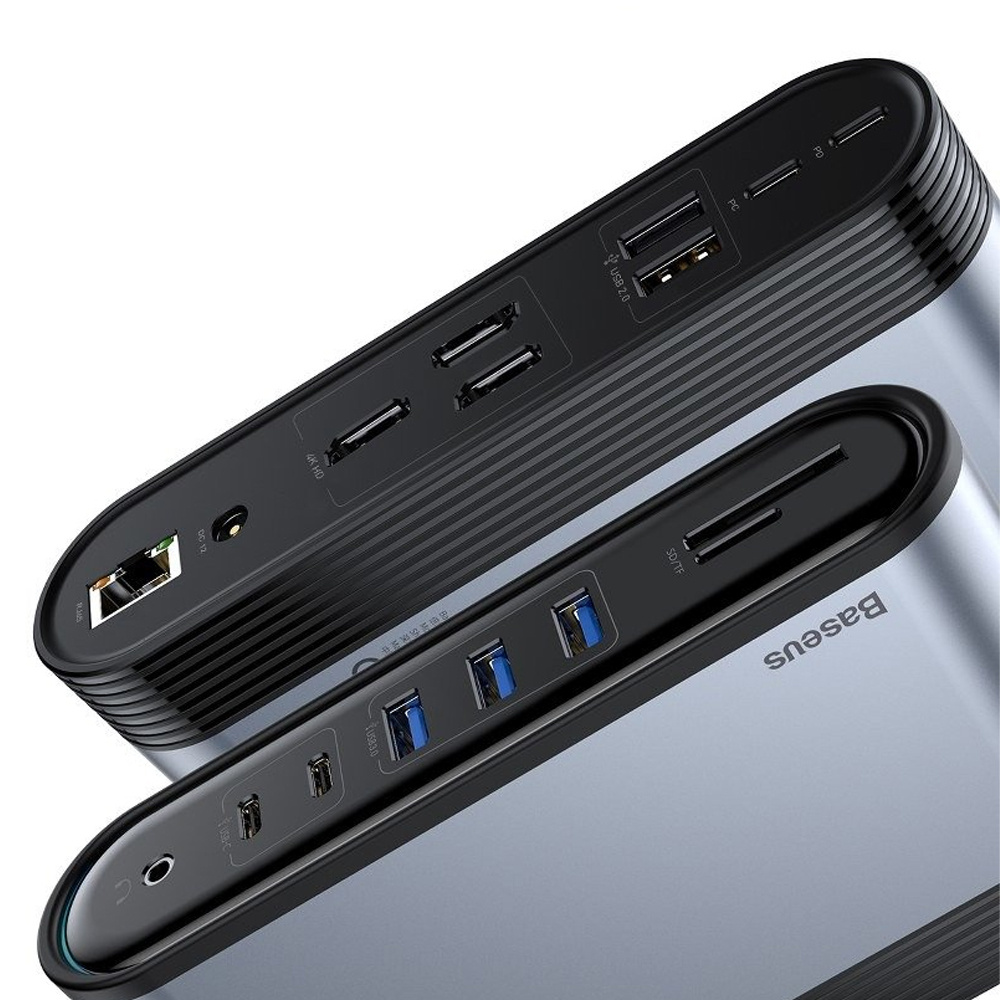 HUB od značky Baseus má 17 vstupov: RJ45, DC 12V, 3x HDMI, 2x USB 2.0, PD PC, port pre slúchadlá, 2x USB-C, a 3x USB 3.0, ako aj dva porty pre pamäťové karty SD a micro SD. Náboj je vyrobený z kvalitných materiálov, odolný voči poškriabaniu a drobnému mechanickému poškodeniu. Vysoko kvalitný hliník zaisťuje odolnosť a pevnosť. Hub umožňuje extrémne rýchly prenos dát. Pomocou portov USB 3.0 môžete prenášať všetky dôležité dokumenty rýchlosťou 5 Gbps (500 Mbps) a pomocou USB 2.0 rýchlosťou 480 Mbps. Prenášajte fotografie, videá a ďalšie súbory rýchlosťou blesku.