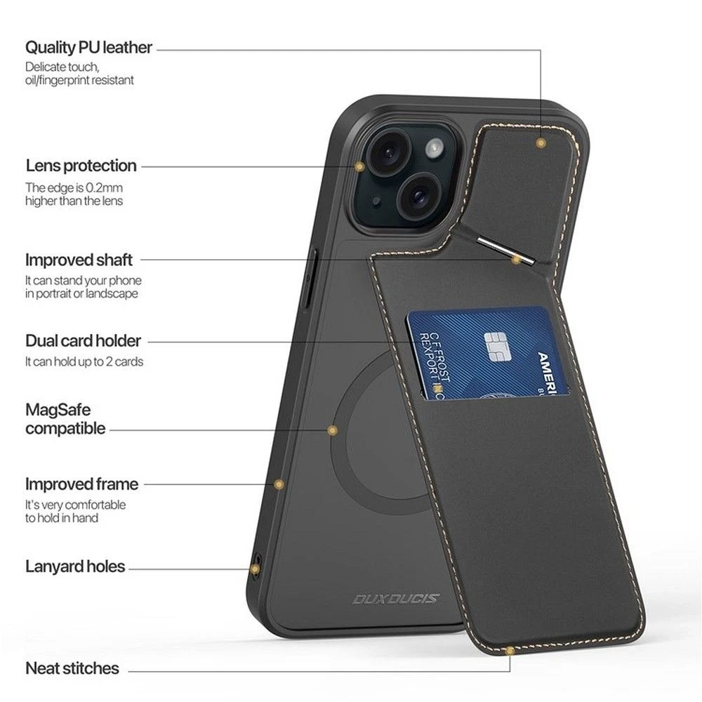 Puzdro Dux Ducis Rafi II Mag je pokročilé riešenie pre smartfóny, kompatibilné s MagSafe. Má dve vrecká na karty, RAFID zámok a nastaviteľný stojan.