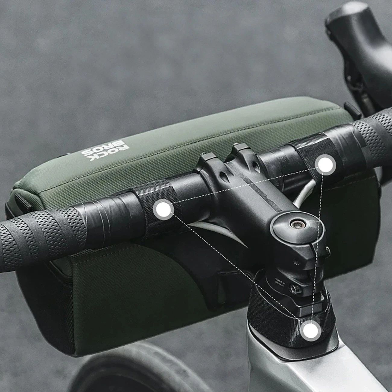 • Taška na riadidlá Rockbros 30110054001: objem 2,2 l je ideálna pre svetlo na bicykel, multifunkčné náradie a powerbanku. Stabilné, ľahko zostaviteľné, s bočnými vreckami a odrazkami. Môžete ho nosiť na ramene. Zelená farba.