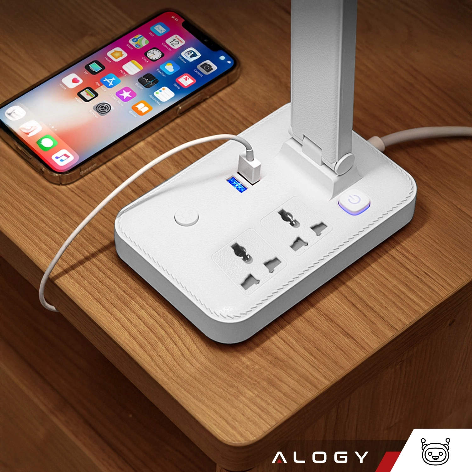 Stolová lampa Alogy, 2 zásuvky, 2x USB, biela LED nabíjacia lampa so stojanom na telefón