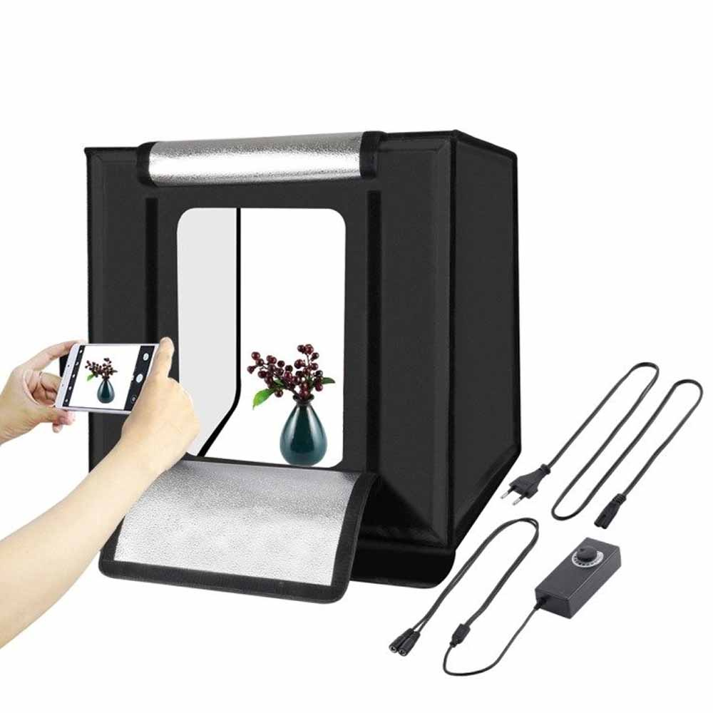 Stan má otvorený vrchný kryt, takže môžeme fotiť aj zhora. Univerzálne pozadia v sete vám umožnia prispôsobiť farby konkrétnemu produktu. Ako príslušenstvo sú k dispozícii aj ďalšie pozadia. Vstavané LED panely poskytujú dokonalé osvetlenie stanu. Lampy majú tiež možnosť meniť svoju polohu, takže si môžeme nezávisle nastaviť smer svetla. Jednoduchý dizajn vám umožní postaviť stan za pár minút. Jeho malé rozmery umožňujú bezproblémový transport.