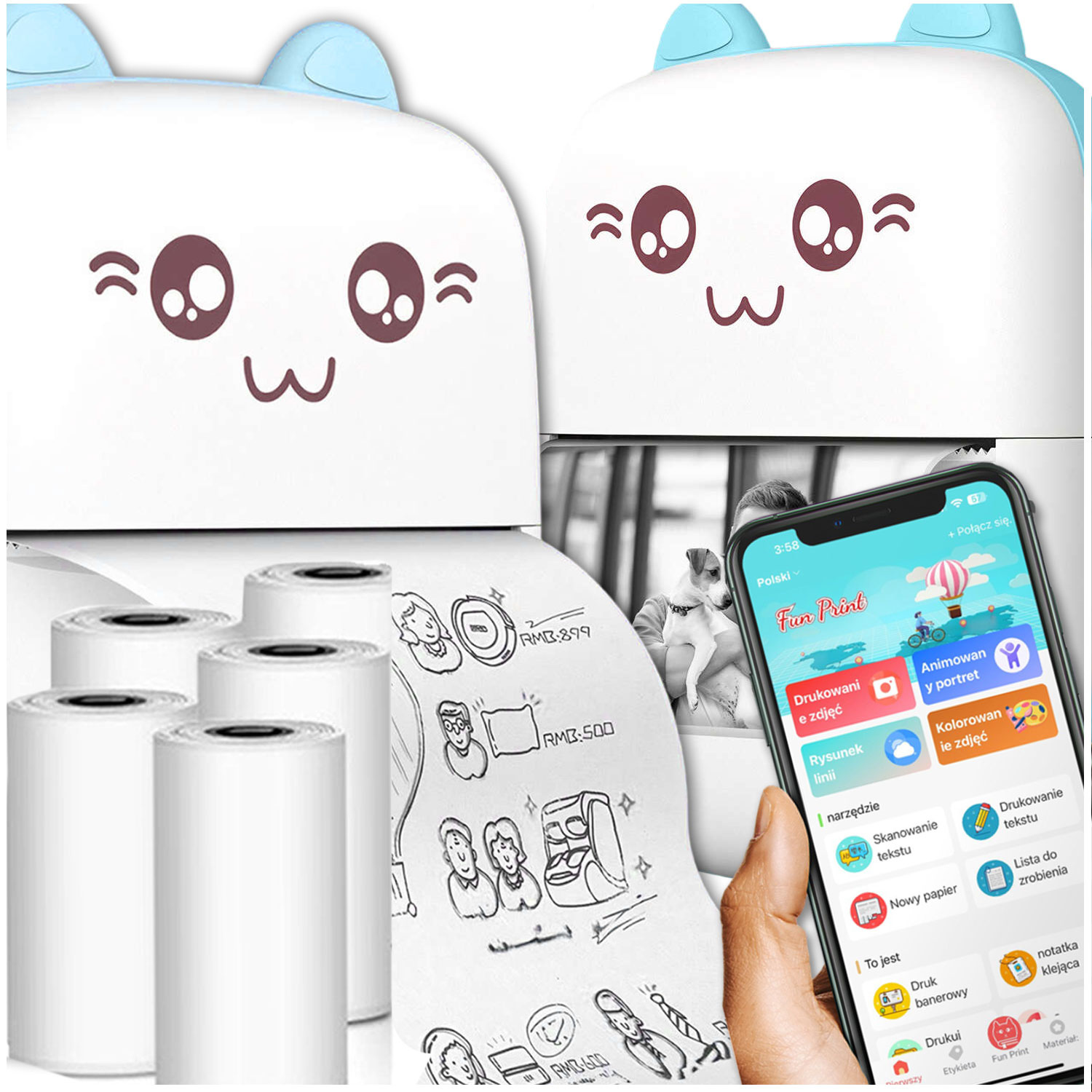 • Termálna tlačiareň Drukuś so 6 rolkami termopapiera pre deti je kompaktné zariadenie, ktoré umožňuje rýchlu a bezproblémovú tlač na špeciálny termopapier. Funguje bez použitia atramentu alebo tonera.