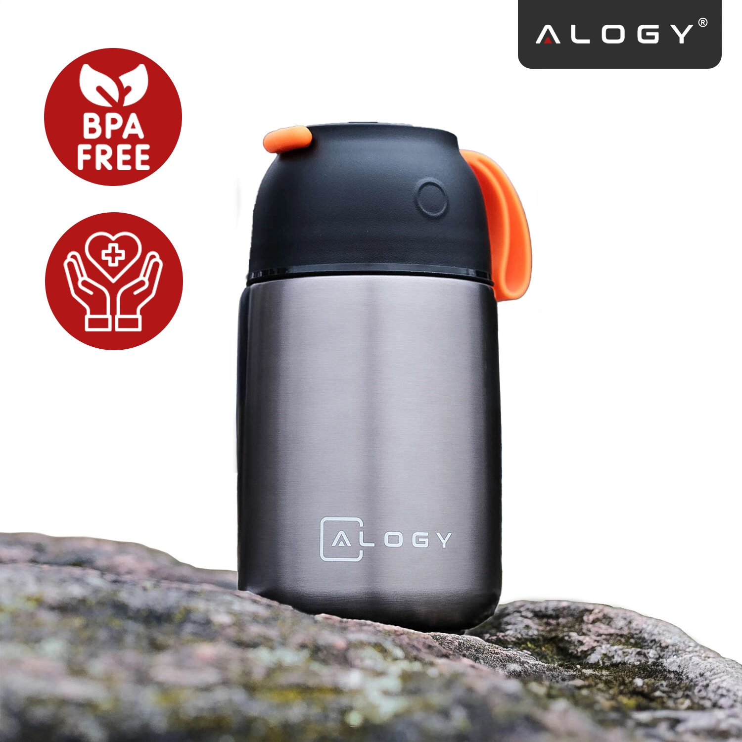 Termoska Alogy ponúka inovatívne riešenia, ako napríklad: Tesný kryt, Protišmyková stojan, vstavaná miska, tlačidlo uvoľnenia , Široký otvor, Odnímateľná lyžica, Leštená, ľahko sa čistí telo.