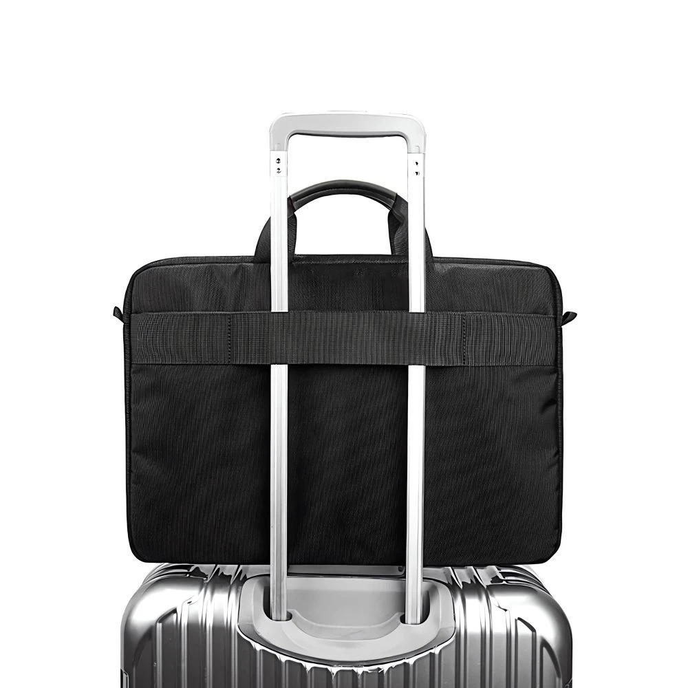 Dołączony regulowany pasek na ramię oraz wygodny uchwyt do ręki umożliwiają komfortowe noszenie – zarówno na co dzień, jak i w podróży. Czarna kolorystyka i minimalistyczny design świetnie komponują się z każdym stylem – biznesowym i casualowym.