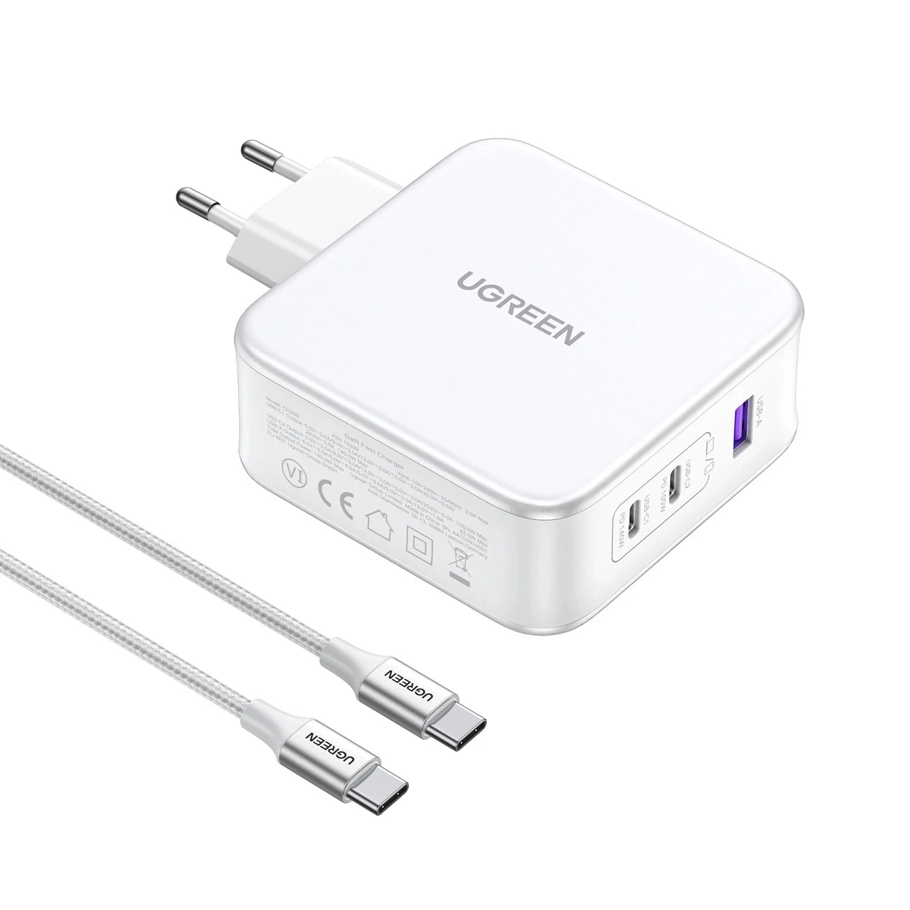 Ugreen Nexode CD289 GaN sieťová nabíjačka USB-A/2xUSB-C 140W USB-C - USB-C kábel 1,5m - biely