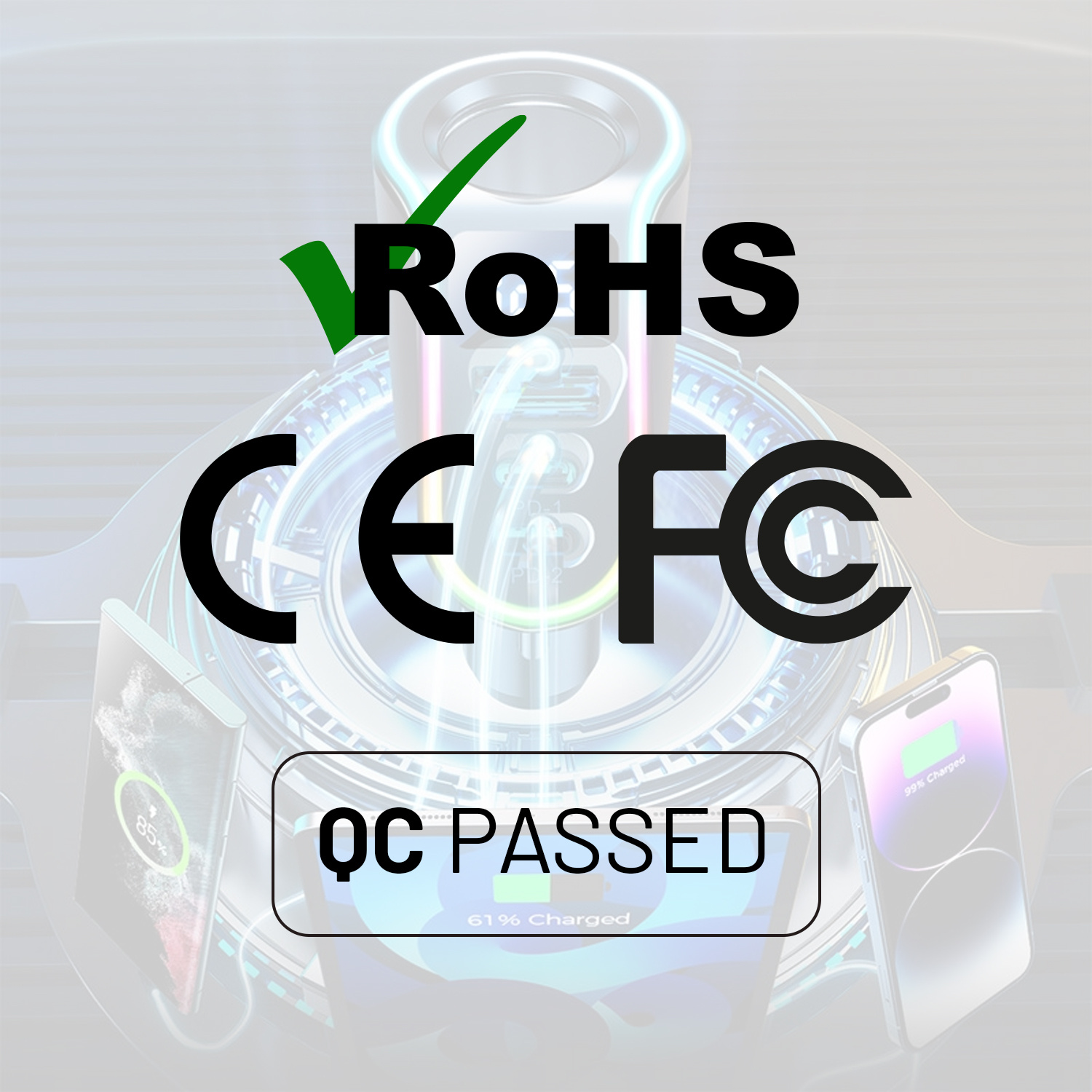 Nabíjačka má certifikáty CE, ROHS, FCC a QC PASSED