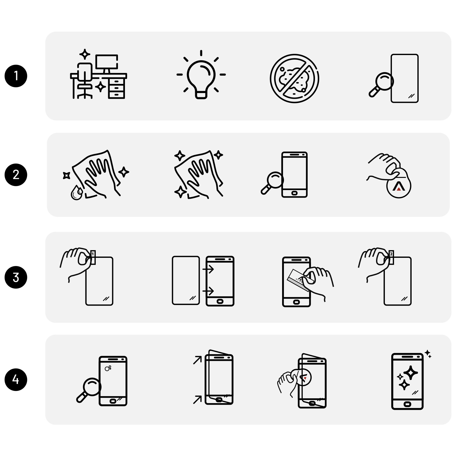 1️⃣ Підготовка: необхідна правильна підготовка - забезпечте чисте середовище, достатнє освітлення та відсутність пилу. Перед встановленням перевірте скло та переконайтеся, що воно повністю сумісне з вашим пристроєм.
