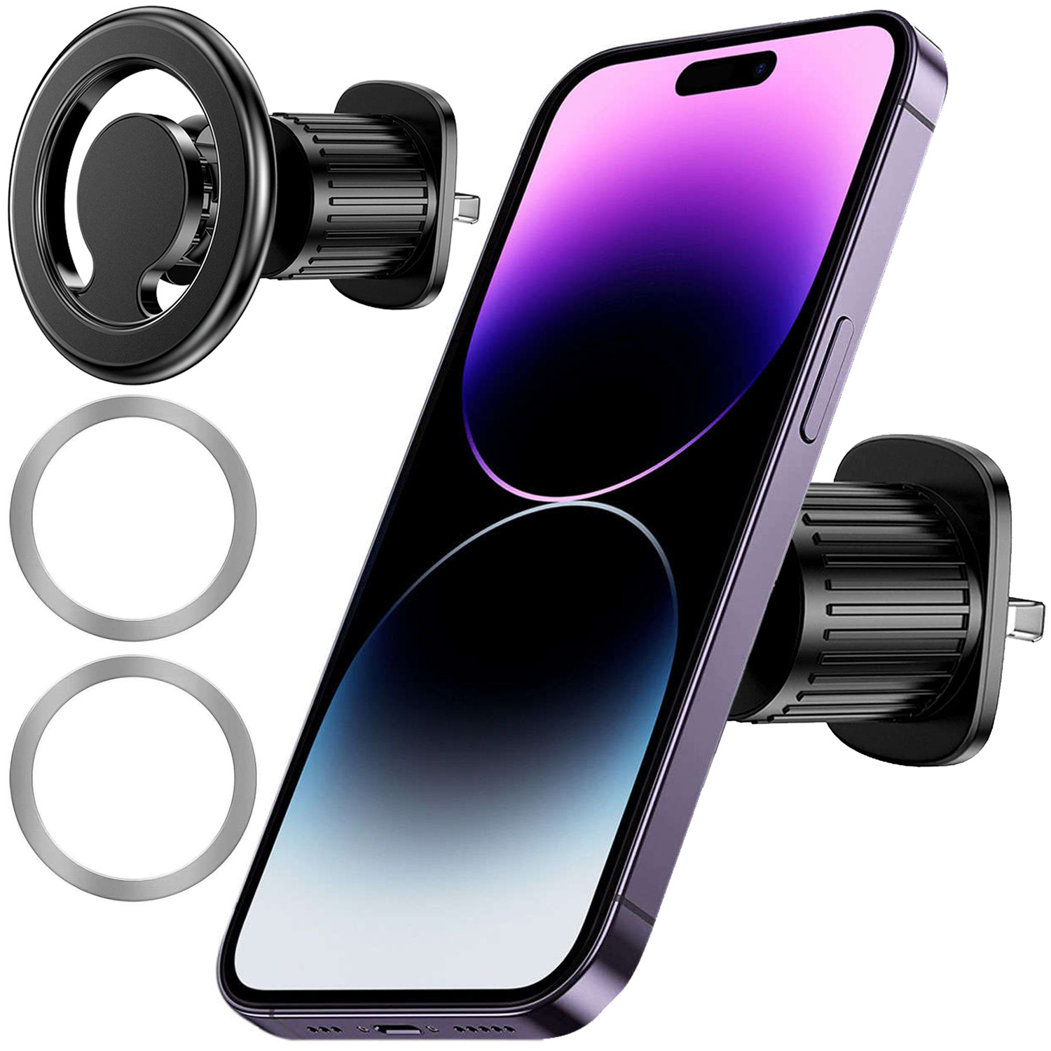 Магнітний автомобільний тримач , призначений для пристроїв Apple із вбудованою технологією MagSafe і для всіх інших пристроїв після попереднього встановлення магнітного кільця або магнітного футляра .