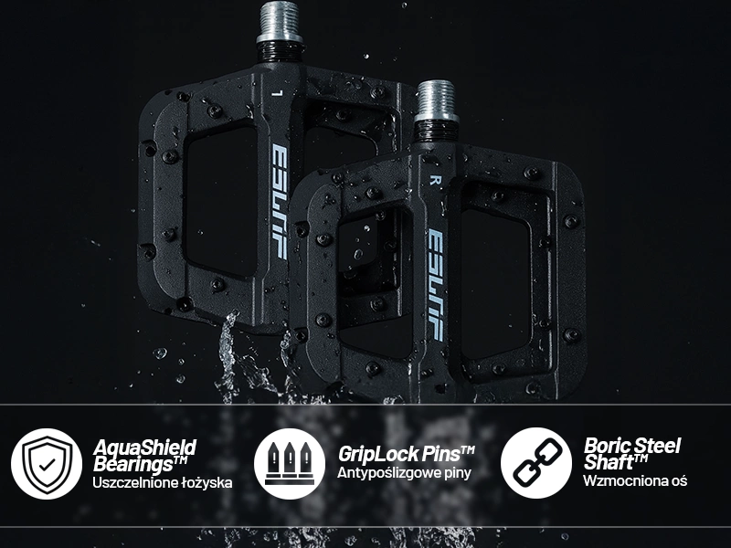 ✅ Їзда по мокрій поверхні, багнюці чи камінню вимагає міцного зчеплення. Нейлонова платформа зі штифтами GripLock Pins™ надійно утримує черевик, а три герметичні підшипники AquaShield Bearings™ забезпечують плавний хід без люфту.