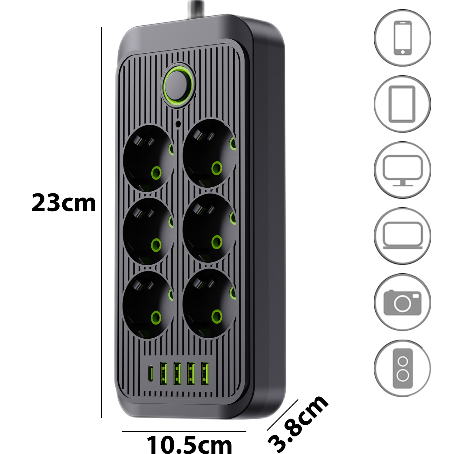 • Подовжувач Подовжувач 6 гнізд AC EU розетки 4x USB USB-C тип C розетки 2500 Вт дозволяє живити електрообладнання за допомогою велок стандарту ЄС, а також дозволяє швидко і зручно заряджати акумулятори в портативних пристроях.