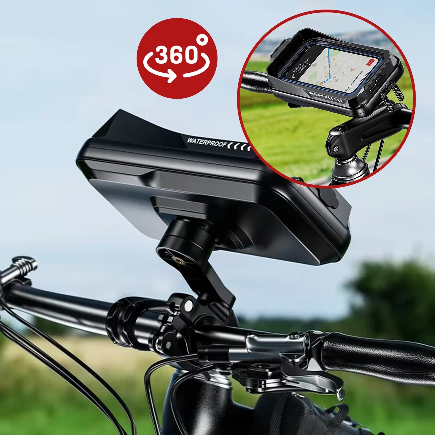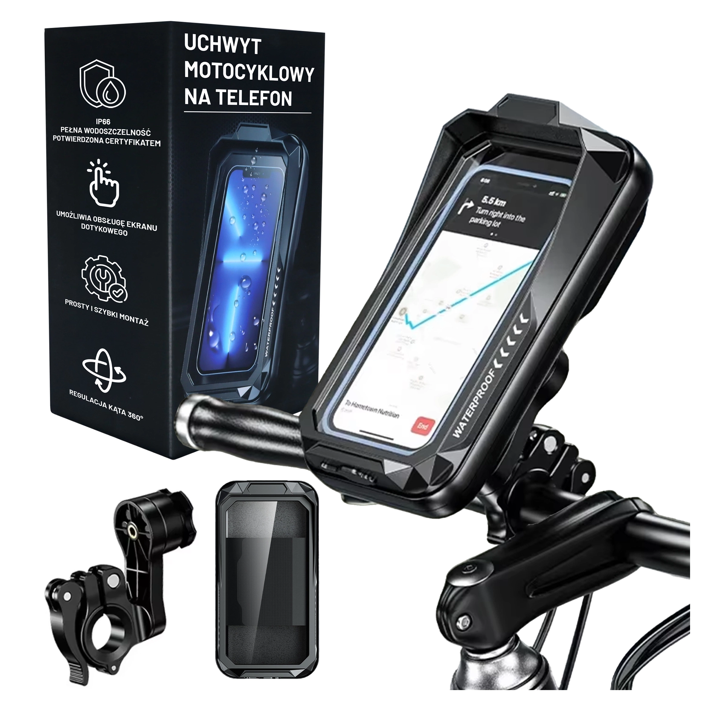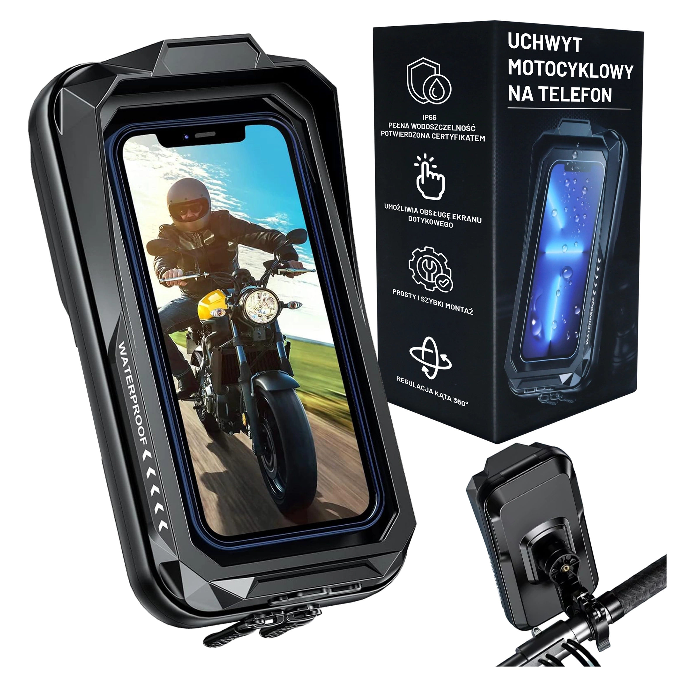 ⭐ Найновіша модель ⭐ Сертифікат водонепроникності IP66 ⭐ ShockGuard™ – захист від ударів ⭐ Обертання на 360° – повне регулювання кута ⭐ SensitiveTouch™ – чутливий сенсорний екран ⭐ SunBlock Visor™ – сонцезахисний козирок ⭐ Підходить для телефонів діагоналлю до 7,0 дюймів ⭐ Кріплення на кермо 22-32 мм ⭐ Вбудована кишеня для карток та ключів ⭐ 10 років досвіду в галузі ⭐ понад 50 000 задоволених клієнтів ⭐